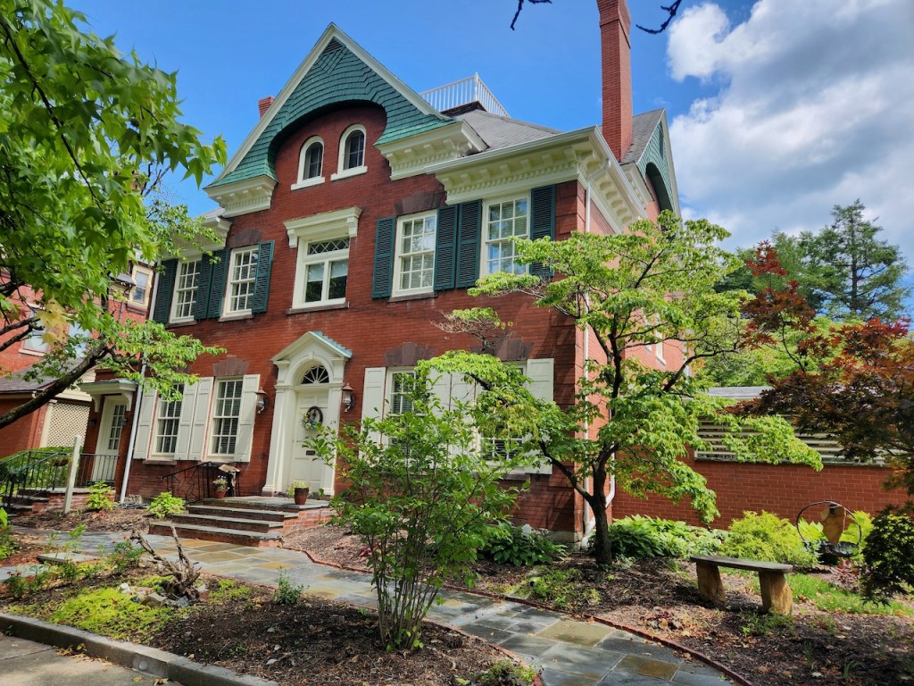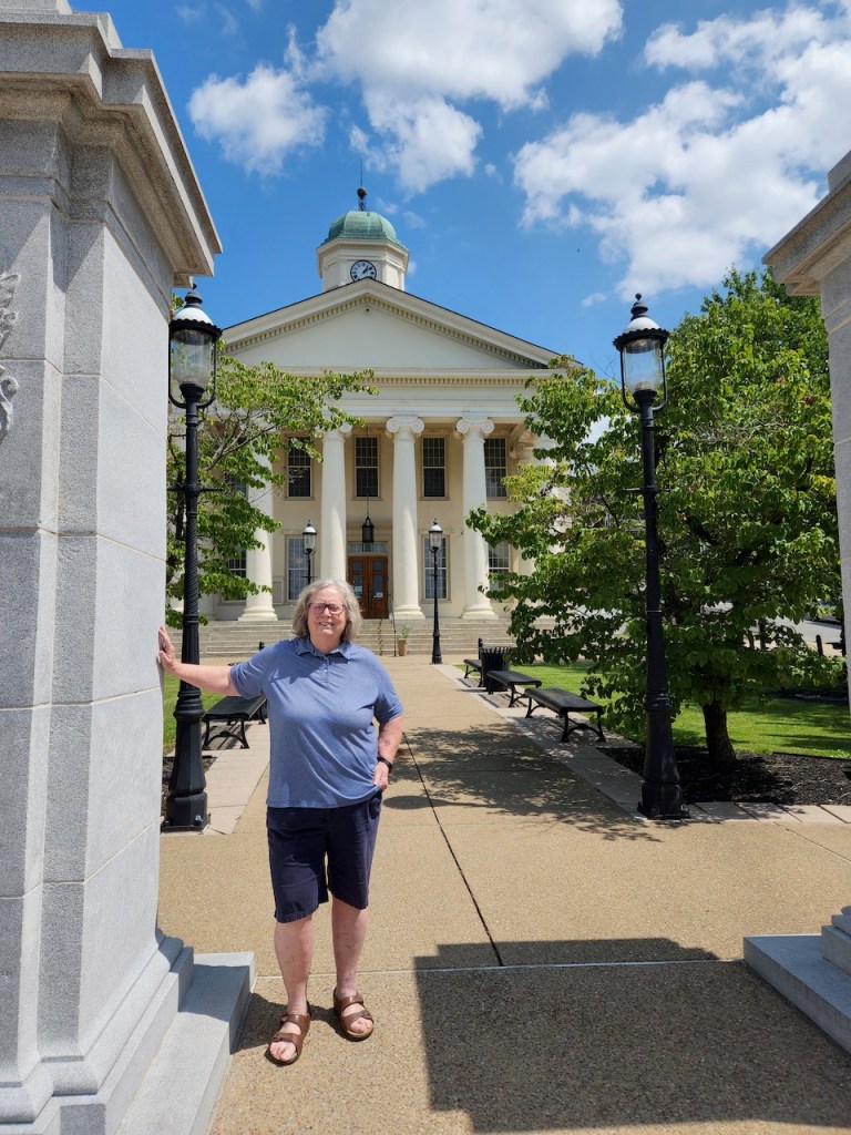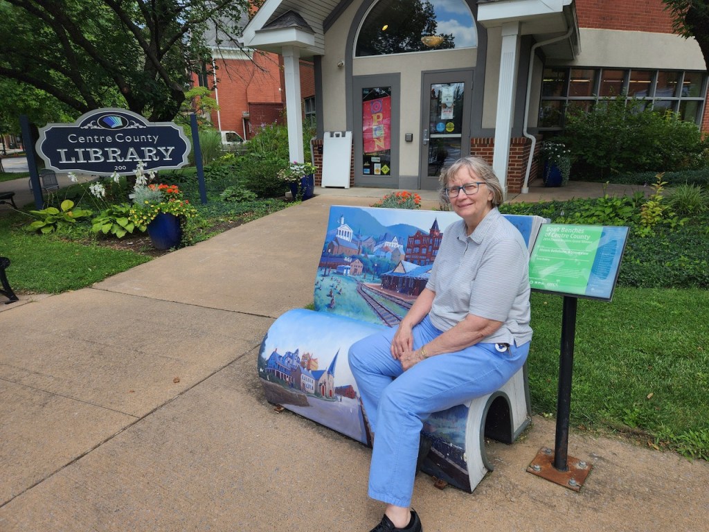 That’s me on a book bench in front of the new library, and our RV parked next to the Miles-Potter-Humes house.