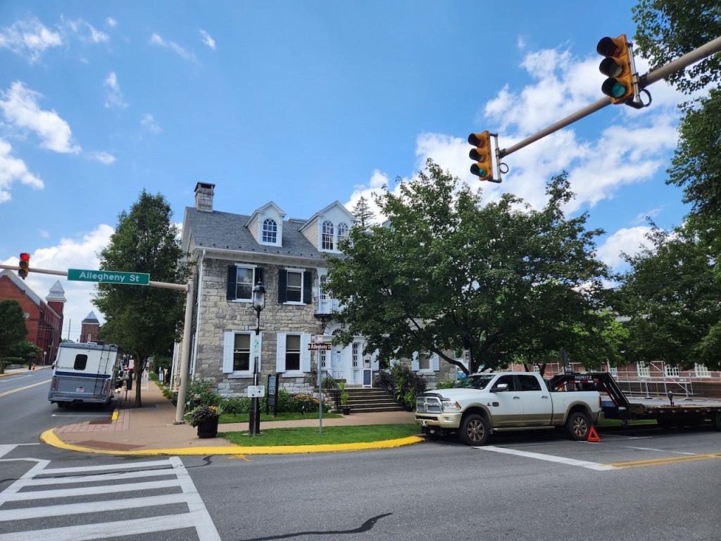 On Friday, as we were driving through PA we stopped in a town called Bellefonte. Our first stop was the Miles-Potter-Humes House, which was built in 1816 by Joseph Miles, the co-founder of the Centre Furnace Iron Works. It was sold to the Potters in 1830 and after going through several generations in 1934 it was donated to be a library when Ann Humes passed away. When the main library moved into the abandoned A&P across the street in 1977, the county historical and genealogical records were left in the house, which is now the Centre County Library & Historical Museum. The attendant in the library was very knowledgeable and gave us nice tour of the building and museum.
