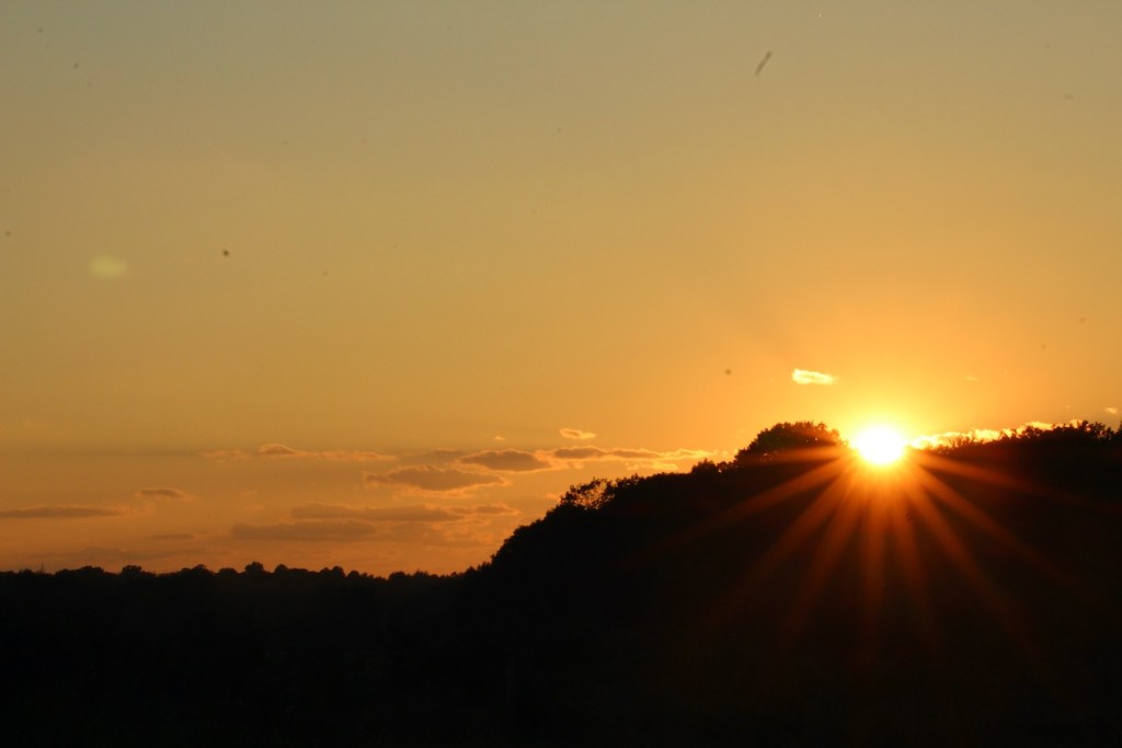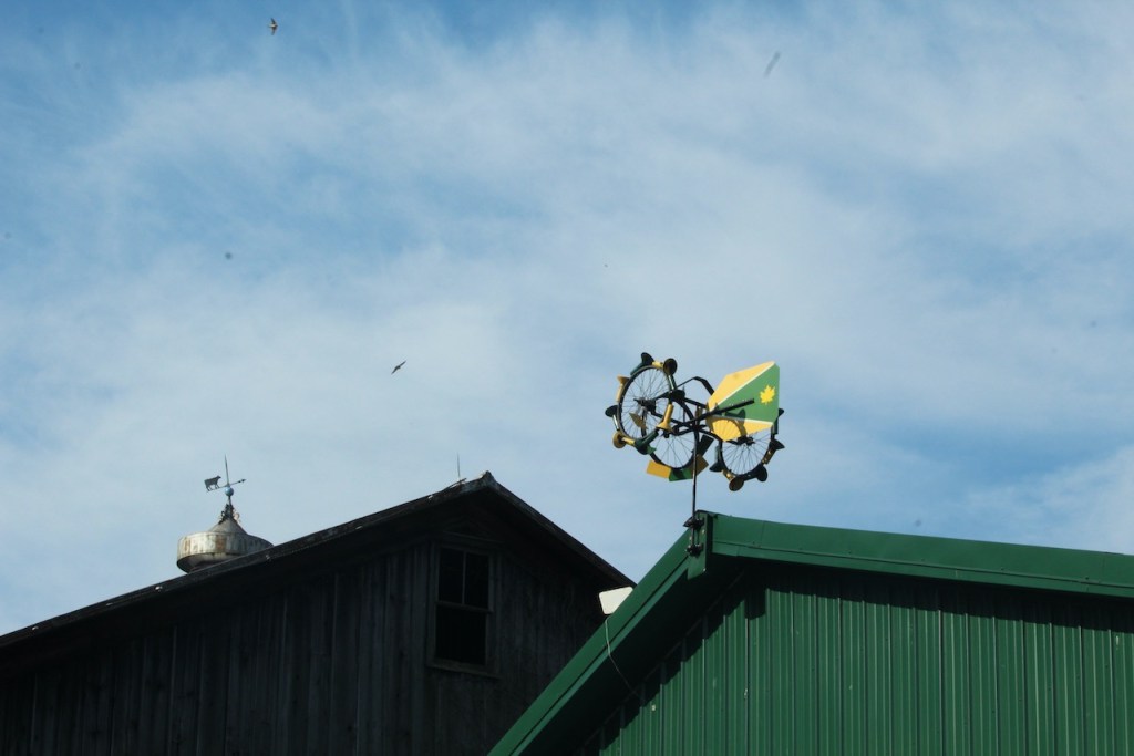 Some views of the farm including Trish and the RV in our evening parking spot. That weather vane was made by a 12-year old Amish boy. And that’s a bluebird and an evening selfie.