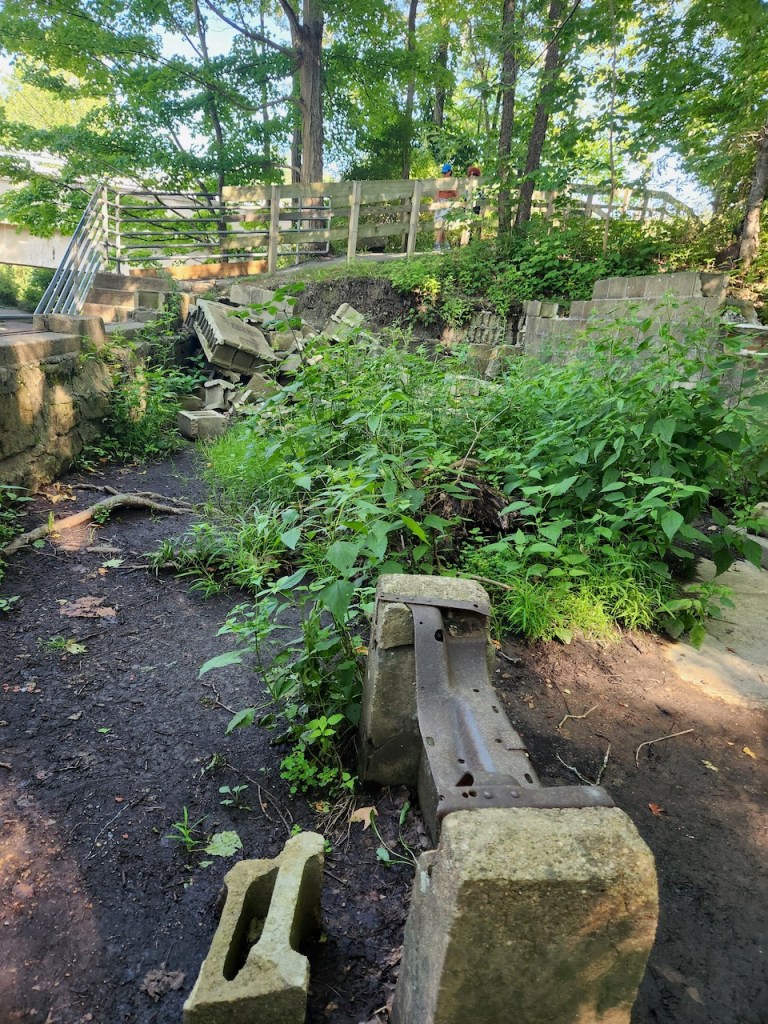 Using the power from the falls, there was once a thriving village at the falls, with a gristmill, sawmill, distillery, and woolen mill. The only things remaining are some of the foundations of the buildings.