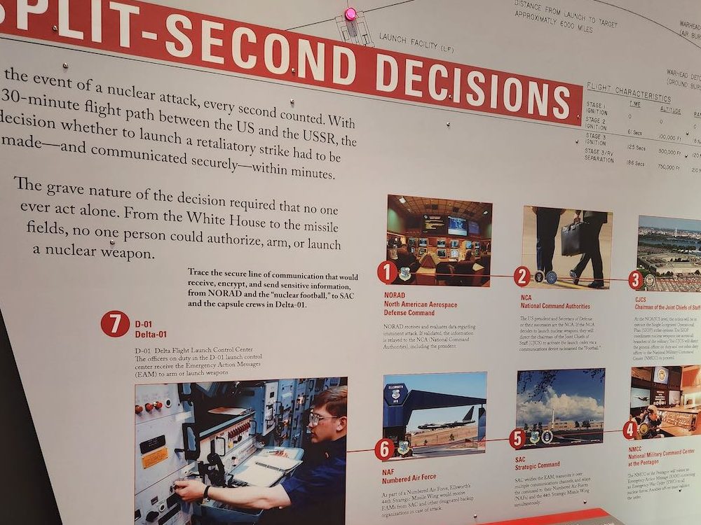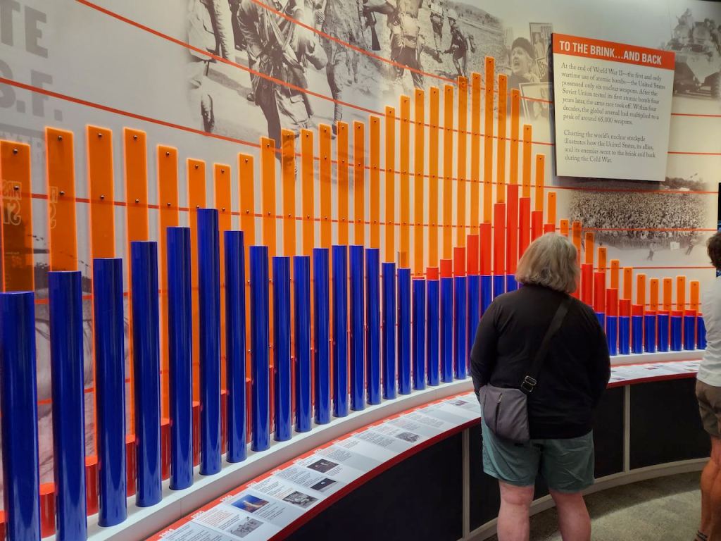 The Visitors Center for the Minuteman National Historic Site, and a graphic showing the number of nuclear missiles, blue is the US, dark red is USSR/Russia, and the orange is the total in the world.