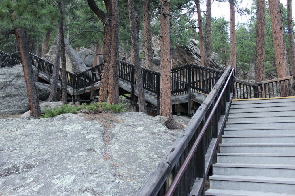 After going through the museum and watching the movie about the construction of the monument, we decided to at least start the President’s Trail. there are warnings that it is strenuous and there are 465 steps, but it takes you out to the edge of the blasted off rock field at the base of the monument, so you get some closer views. (Trish calls that boulder field vomit, saying that these guys would be throwing up if they were part of the political scene today.)