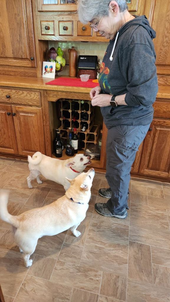 Terry giving Ziva and McGee treats after their walk. They are very cute together – and are a chihuahua and husky mix. And yes, Ziva had ACL surgery so her rear right leg is shaved.