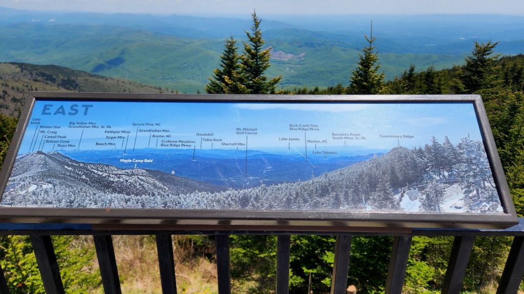 Sunday we drove to Mount Mitchell – the highest peak east of the Mississippi. Given that we are nearly 50 years older, unlike when Terry and I (and our buddy Tina) climbed Mount Washington all the way up from Pinkham’s Notch, we drove to the parking near the peak and only had to walk up about a quarter of a mile to get to the observation platform. The mountain is named for Elisha Mitchell, who died proving that this mountain was higher then Mount Washington. He is buried in the tomb that is behind us in the lower right picture.