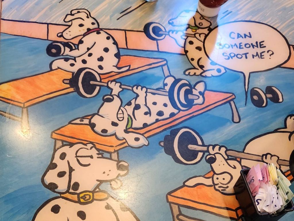 Tuesday it was supposed to pouring all day, so we decided to go to the movies – we saw The Fall Guy. It was cute, but a bit long – if you go be sure to stay, as Lee Majors makes a cameo at the end. After that we went to lunch at Tupelo Honey – Trish got fried chicken. She didn’t have grits here, but this wall was a decoration inside. After that we went to the driving range. We had a tee time for Thursday, but Trish and I hadn’t picked up a club since our trip last fall, so we thought it would be prudent. It was good warmup.