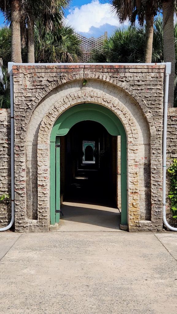 Last shot of Atalaya is the covered walkway from the courtyard, showing the 40 foot tower that was used as a water tower. After pumping the water up to that height, it could flow through the whole house.