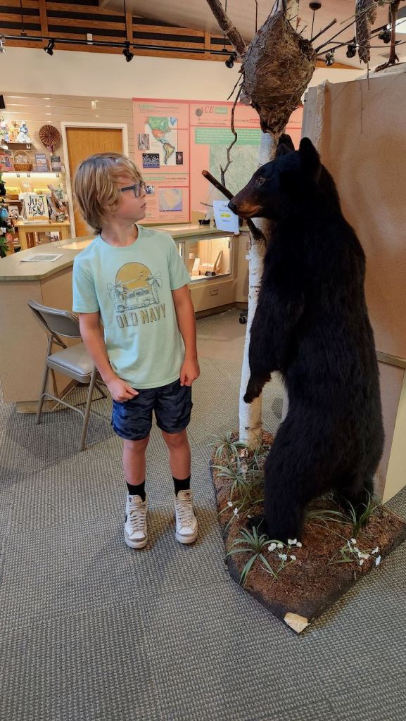 Allie and the boys met us for breakfast on Sunday morning, and then we went for a walk at the Caw Caw Interpretative Center. It’s a rice plantation converted to wetlands and wildlife preserve. Blake ran across this bear in the visitor center and then we saw this little froggy.
