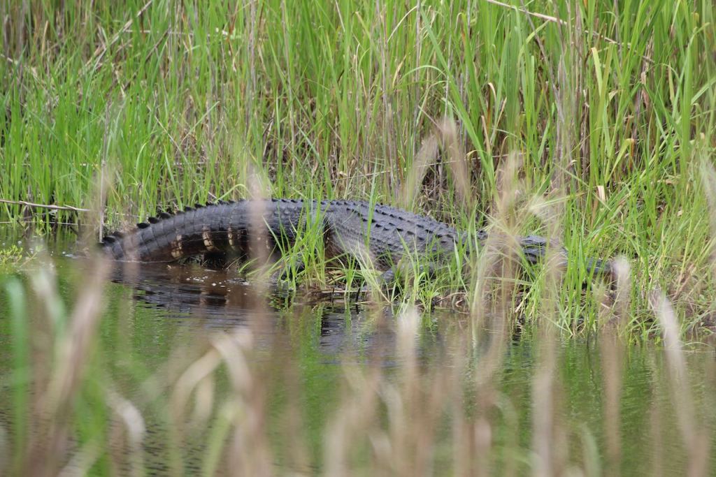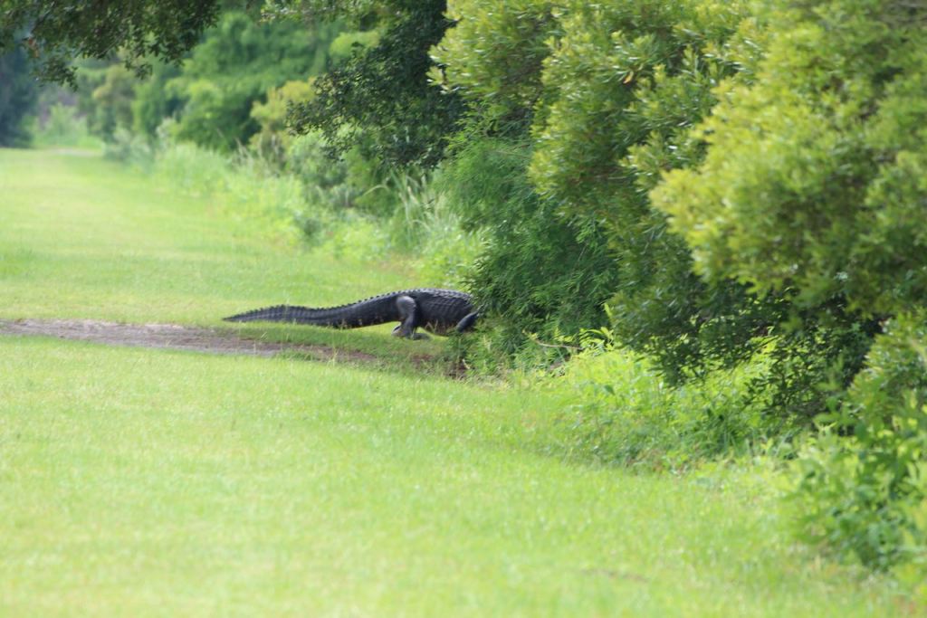 And as we were walking, we saw this big guy cross the path in front of us. Thankfully we had stopped for a few minutes at a wetlands overlook, or we would have been right there when he was crossing. When we got a little beyond, we could get a glimpse of where he settled in.
