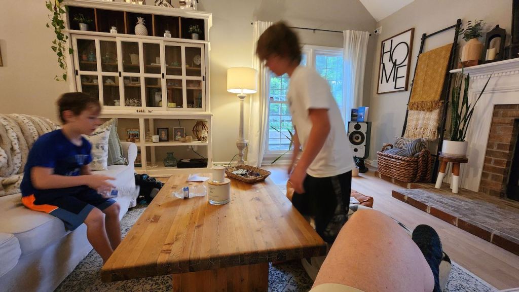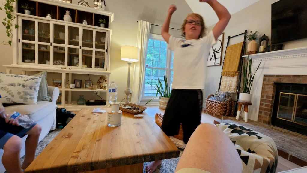 As we were walking off the field, we heard some thunder – not sure they finished any other games as the rain really got steady by the time we got back to Allie’s. We ended up watching The Princess Bride – the boys had never seen it – and playing a game of Yahtzee to while away the dreary afternoon. And Blake and Ben were trying to toss a partially filled water water bottles to land upright – Blake finally stood one up – on top of the candle.