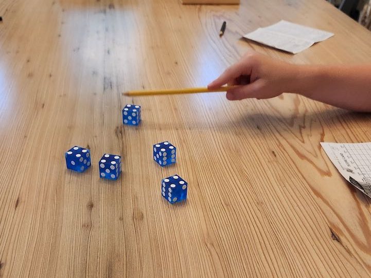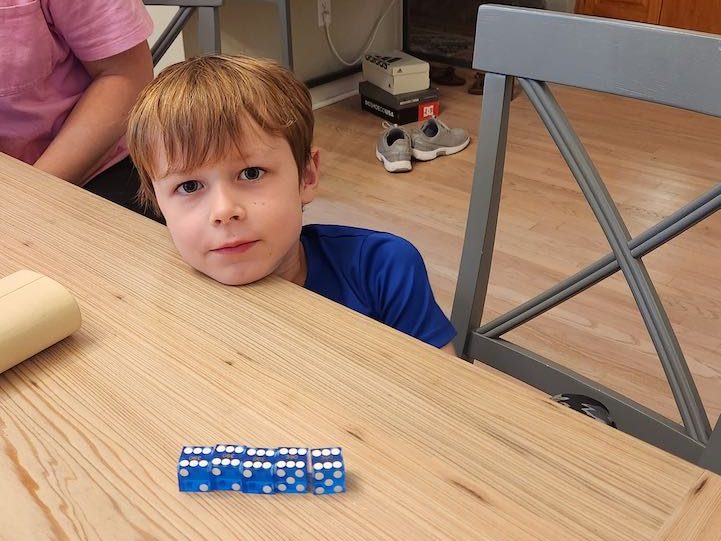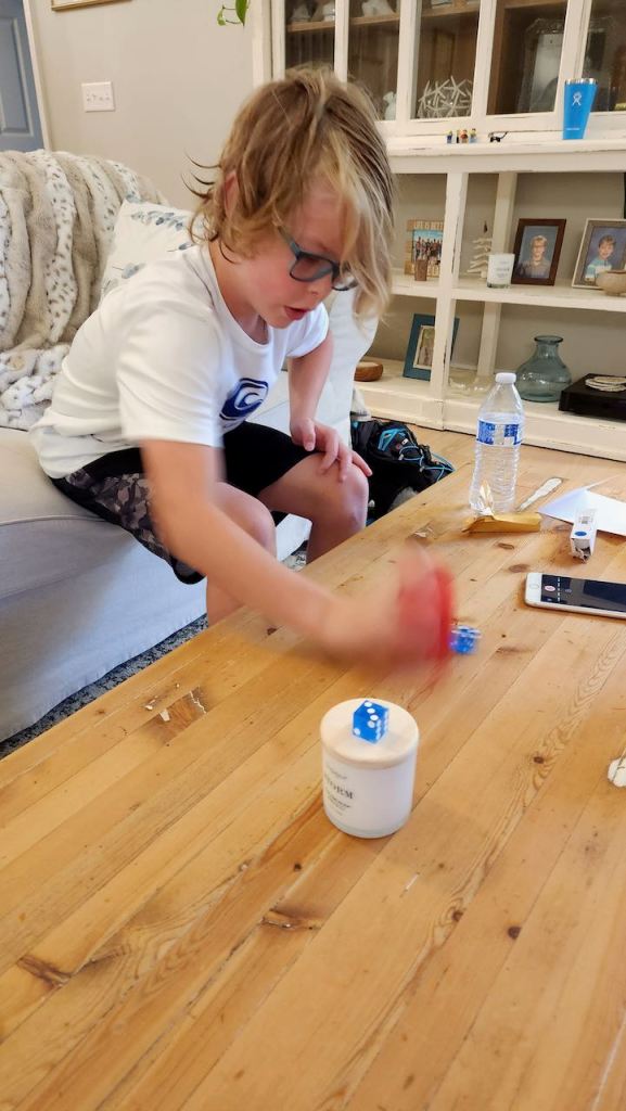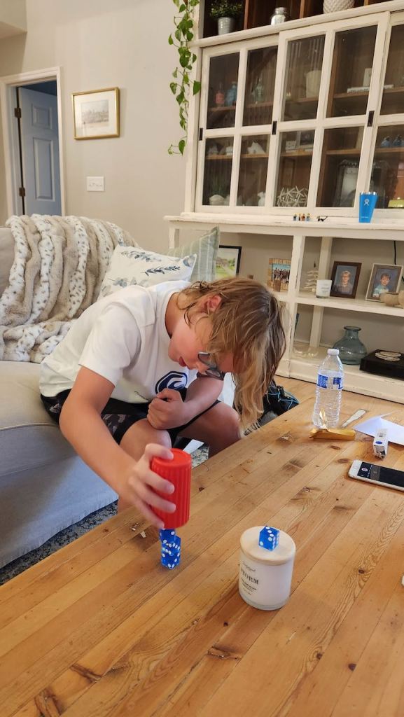 One other thing that Blake was practicing was stacking dice by shaking them back and forth in a cup – my cell phone couldn’t catch his motion, but you can see the results.