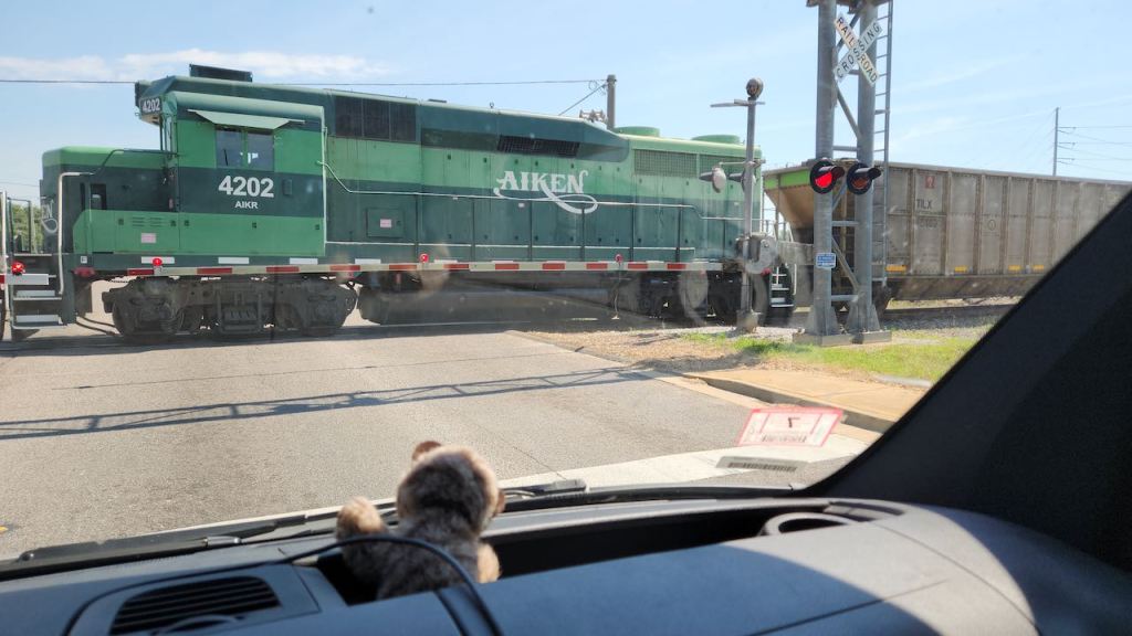 We left Aiken on Wednesday, Jun 12, and I think we had another first – we were stopped by a train on the way out of town. Popoki waited patiently for the train to go by.