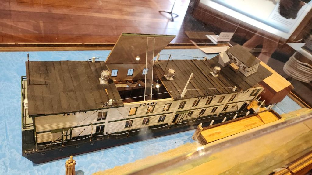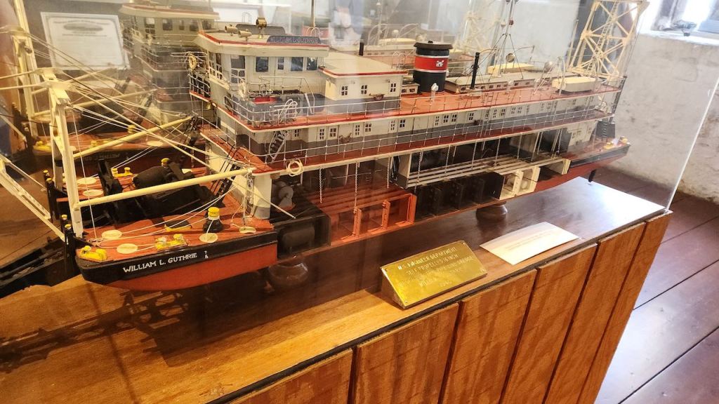 Besides information about the working of the canal, there were these boat models. The one on the left is the William L. Guthrie, which was a dredge that worked on the expansion of the canal in the 1950’s. In the 1920’s the canal and been redesigned to eliminate the locks and in the 50’s it was widened to 450 feet and deepened to 35 feet. The other is a model of the James Adams, which was a floating theater that had performances in the Chesapeake and Delaware Bays in the summer and that wintered in North Carolina.