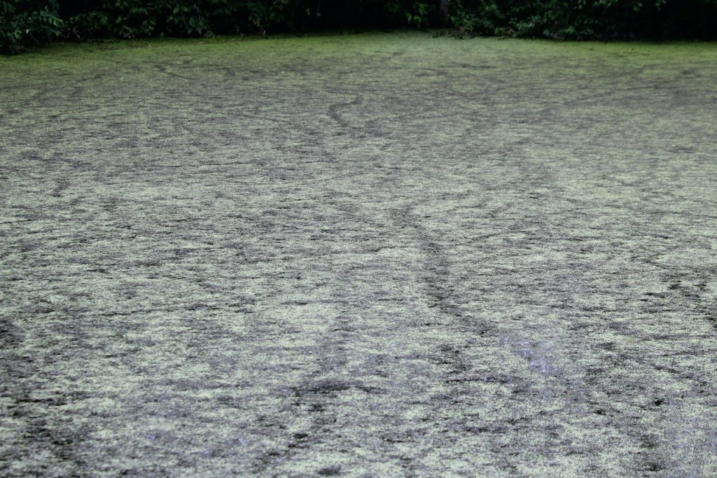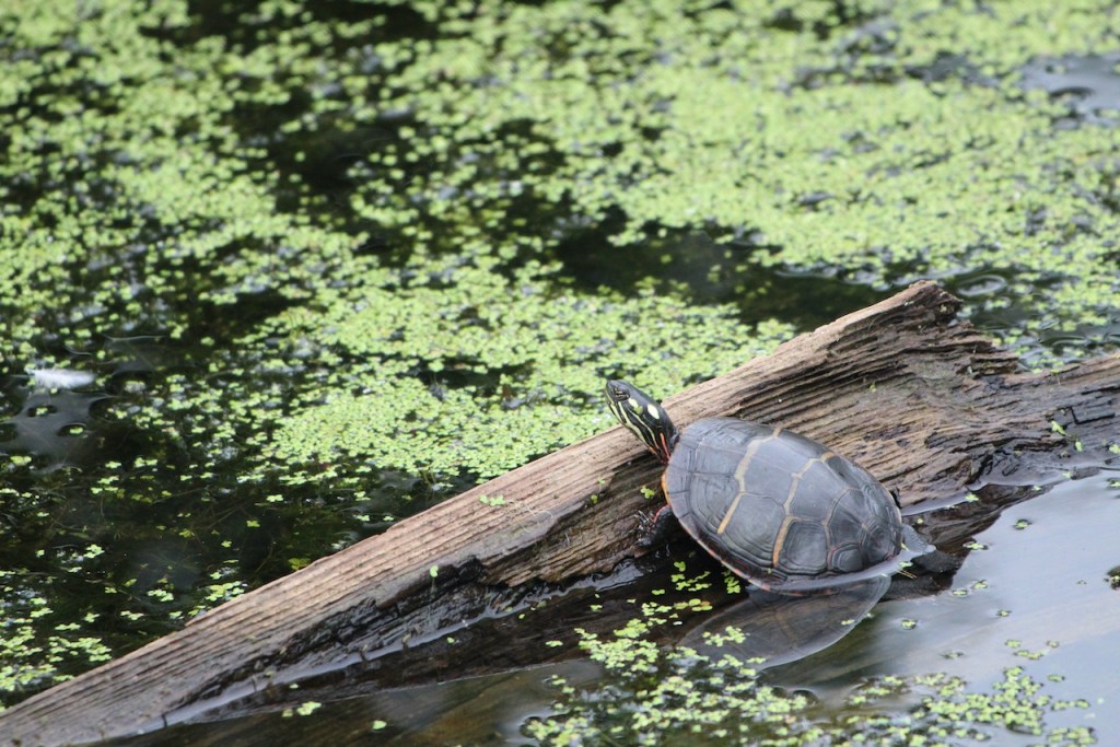 Part of our walk was over a marshy area on a boardwalk. Saw plenty of frogs and turtles, as well as what looked to be trails of something swimming through the algae. Trish finally spotted an otter playing in the little lake.