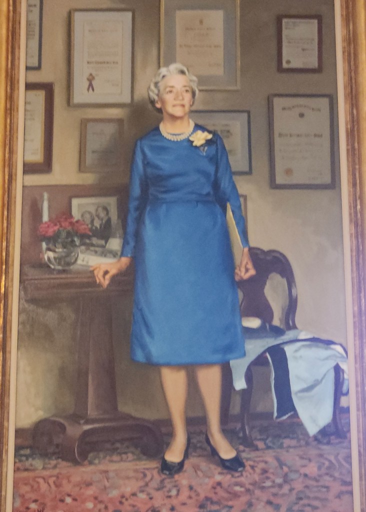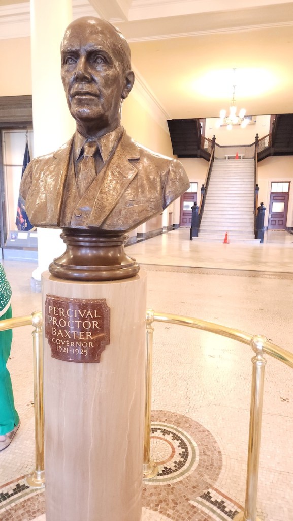 Here are a couple of photos from the Hall of Flags, which is in the center part of the capitol. THese are reproductions of flags that were carried during the Civil War, as well World War I, World War II and the Korean War. In the same area is a portrait of Margaret Chase Smith – she was the first woman to be both a U.S. representative (1940–1949) and a U.S. senator (1949–1973). And there is a bust of Governor Percival Baxter (1921–1925) – who from 1931 to 1962 donated over 200k acres to create and enlarge Baxter State Park in northern Maine.