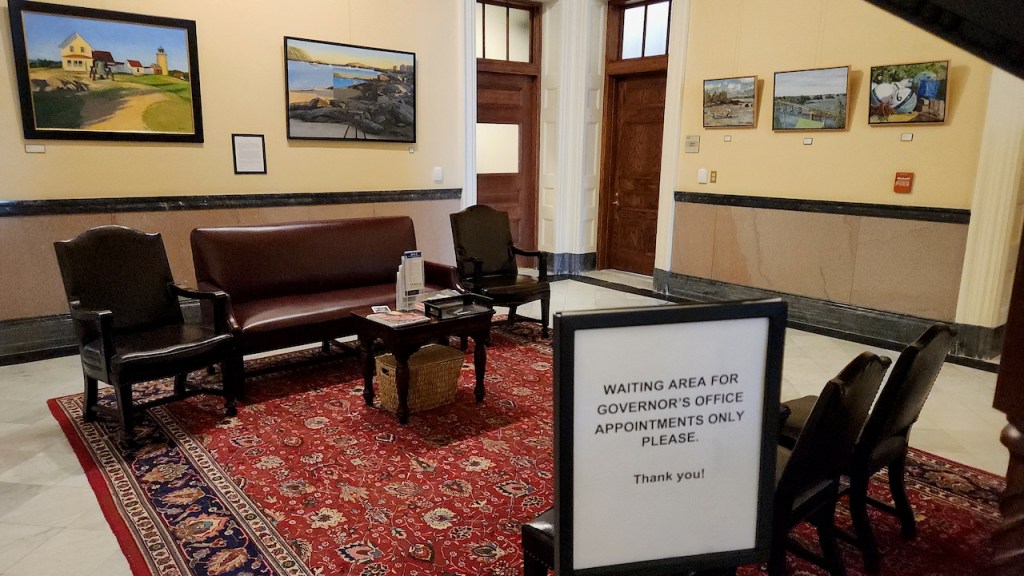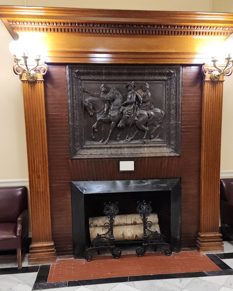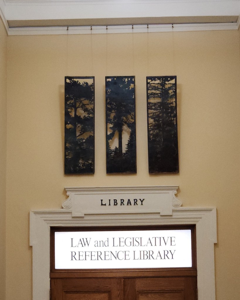 We were not able to go inside the governor’s office, but we did a look at the waiting area – which was decorated with many beautiful paintings of Maine. Nearby was this fireplace with a sculpture of union soldiers and the triptych above the entrance to the library depicts pine trees and is made from copper from the original dome that was replaced in 2014.