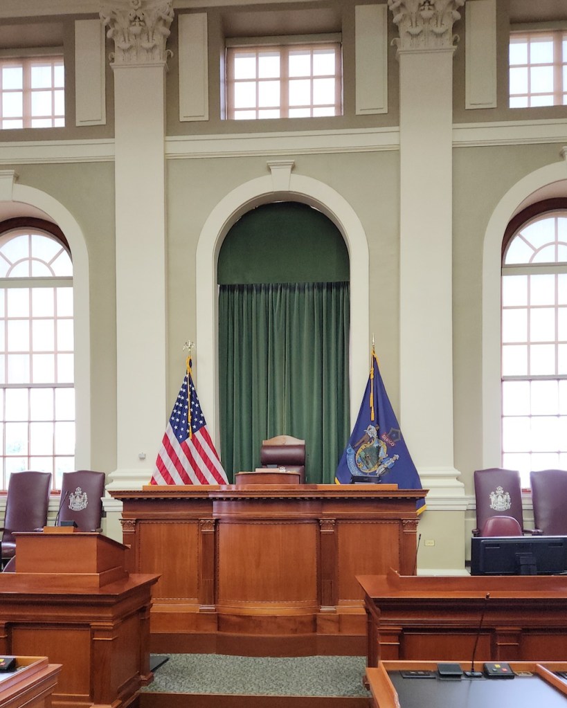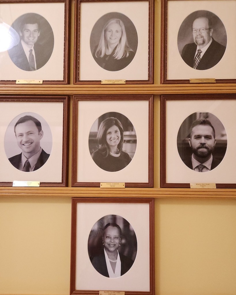 We did get to go into both the House and Senate chambers — as with the rest of the building, the decorations were fairly plain – but the Senate has a great view! The last picture shows 3 of the 4 women who have been Speaker of the House. It was interesting to learn that the Maine legislature creates a two-year budget, so it’s only every other year that they have to deal with the late, long sessions that surround a budget. I also found it interesting that the terms for both the house and the senate are two years, so everyone stands for election at the same time = plus they have term limits of 8 consecutive years – they you have to take some time off – or run for the other chamber.