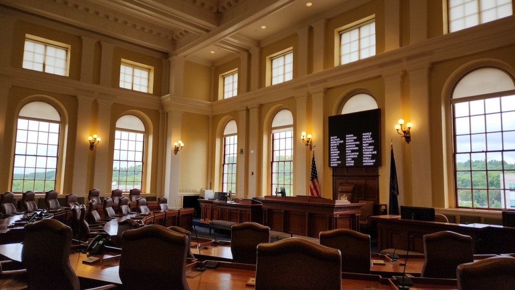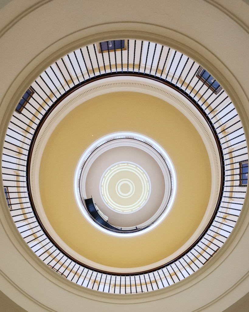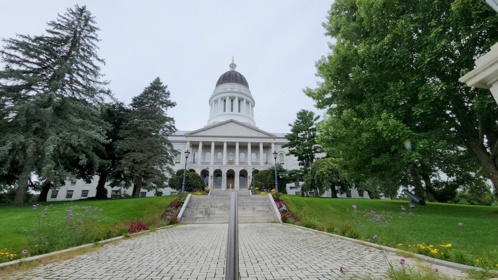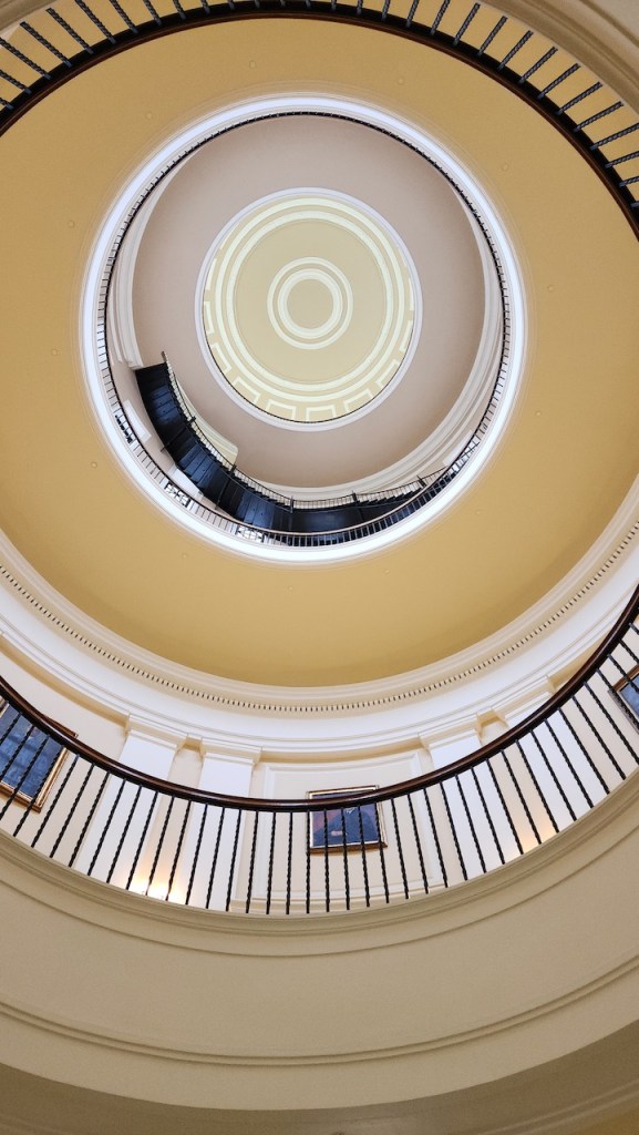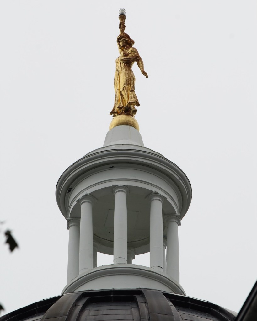 On Tuesday, we had a reservation for a tour of the Maine Capitol at 10 AM, so it was up and at ’em first thing in the morning. Maine became a state in 1820, and the temporary capital was in Portland. In 1827, it was decided to move the capital to Augusta, a bit more centrally located. (If you don’t remember your history, Maine was a part of Massachusetts until it sought to break away after the War of 1812, because Massachusetts didn’t help in its defense.) Here are a few views of the exterior of the building, it was designed by Charles Bullfinch and construction ran from 1829 to 1831. That’s the Lady of Wisdom atop the dome.