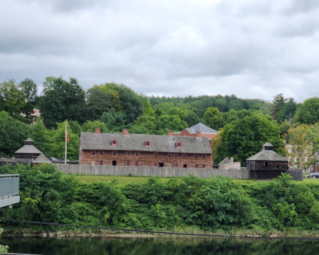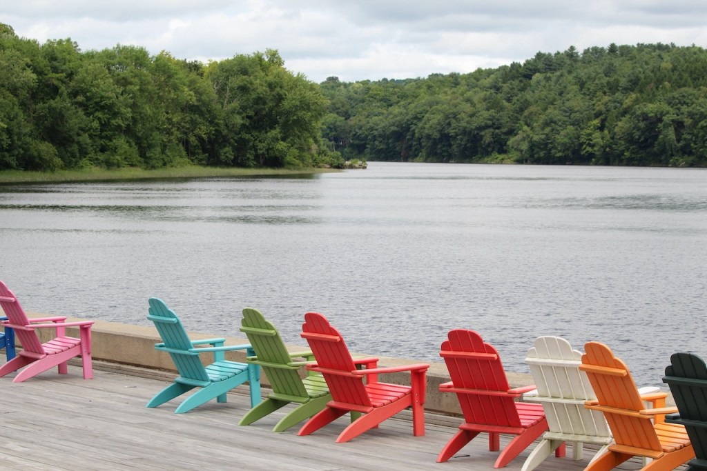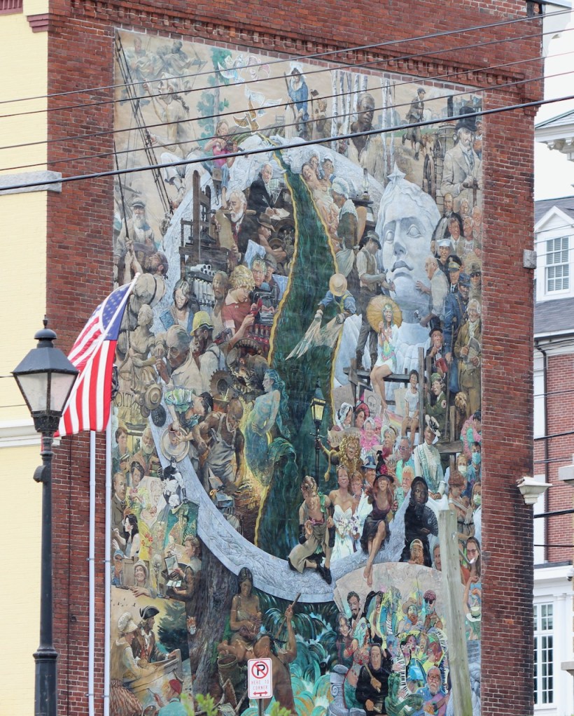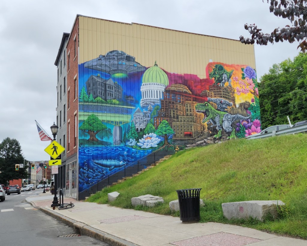 After Augusta, we drove down the river to the town of Hallowell – where they have these rainbow Adirondack chairs on the public landing – free for anyone to use – though with the clouds, there weren’t too many takers when we were there. At one spot along the river, we were able to see the dome of the Capitol building. And the town had another mural.