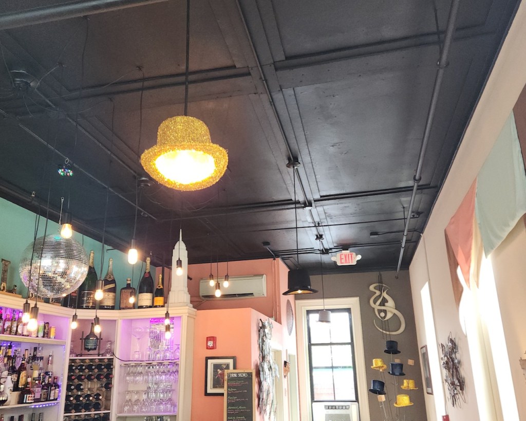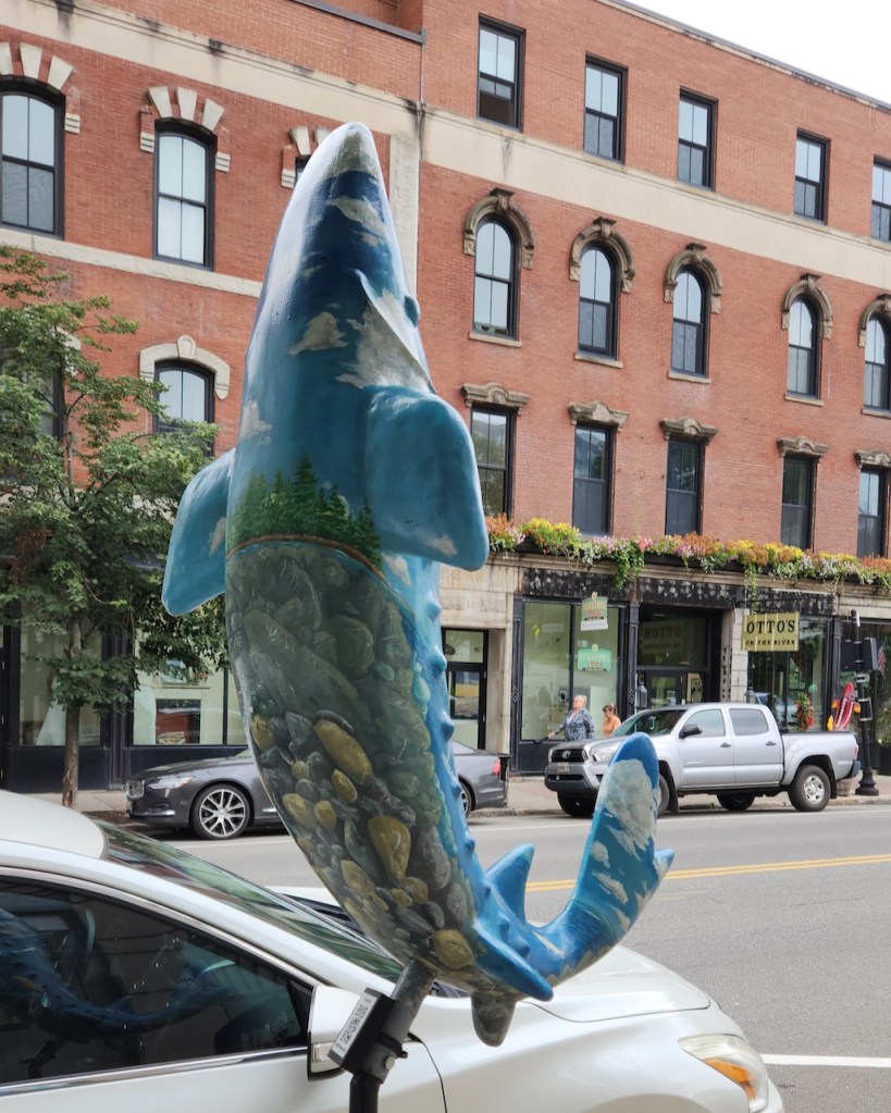 Lunch was at a restaurant in downtown Augusta called Otto’s on the River. It was eclectically decorated – yes, those are bejeweled top hats being used as lampshades – but the food was great. We started with their crab dip, which was delicious, and followed up with a wonderful flatbread. We then walked along Water Street, where we saw this great mural, and probably 15 of these painted sturgeon. They were created in 2022 to highlight how many more sturgeon are spawning in the Kennebec River.