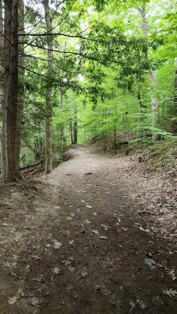 We found another place to go for a walk, the Vaughn Woods in Hallowell. It was about a 2 mile walk around part of the nearly 200 acre property. Although the walk started by skirting a field, the majority of it was through the woods. We crossed over a stream several times – the waterfalls were coming from a dam that you can see in the background. And there were a bunch of these stone bridges of various sizes and sophistication crossing stream beds and wet spots. One spot of the trail comes close to the high school, so there were several groups of cross country runners, male and female, on the trail – I’m sure some of them lapped us.