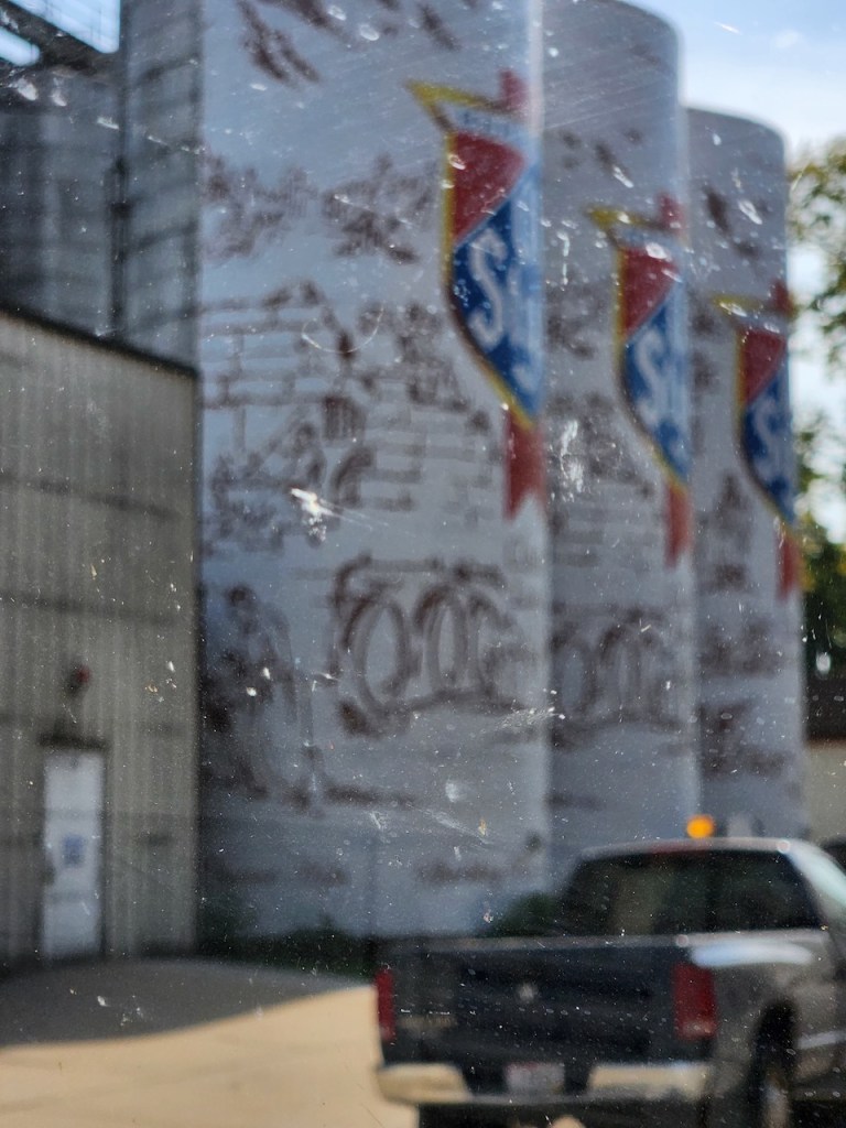 Popoki watching as we drive over Lake Winona. Then we drove through the town of La Crosse. That’s the world’s largest six-pack – actually beer storage tanks for the City Brewing Company. We just drove by and the phone focused on the dirty windshield, but you get the idea.