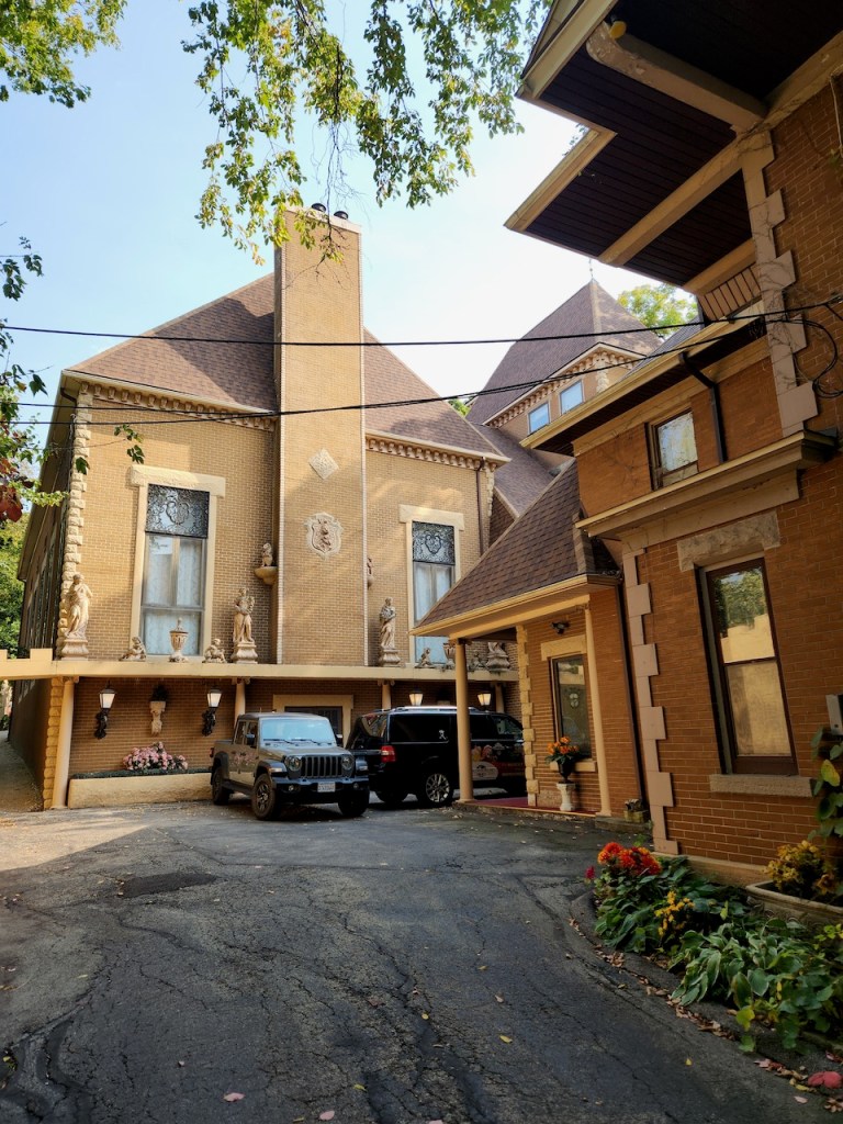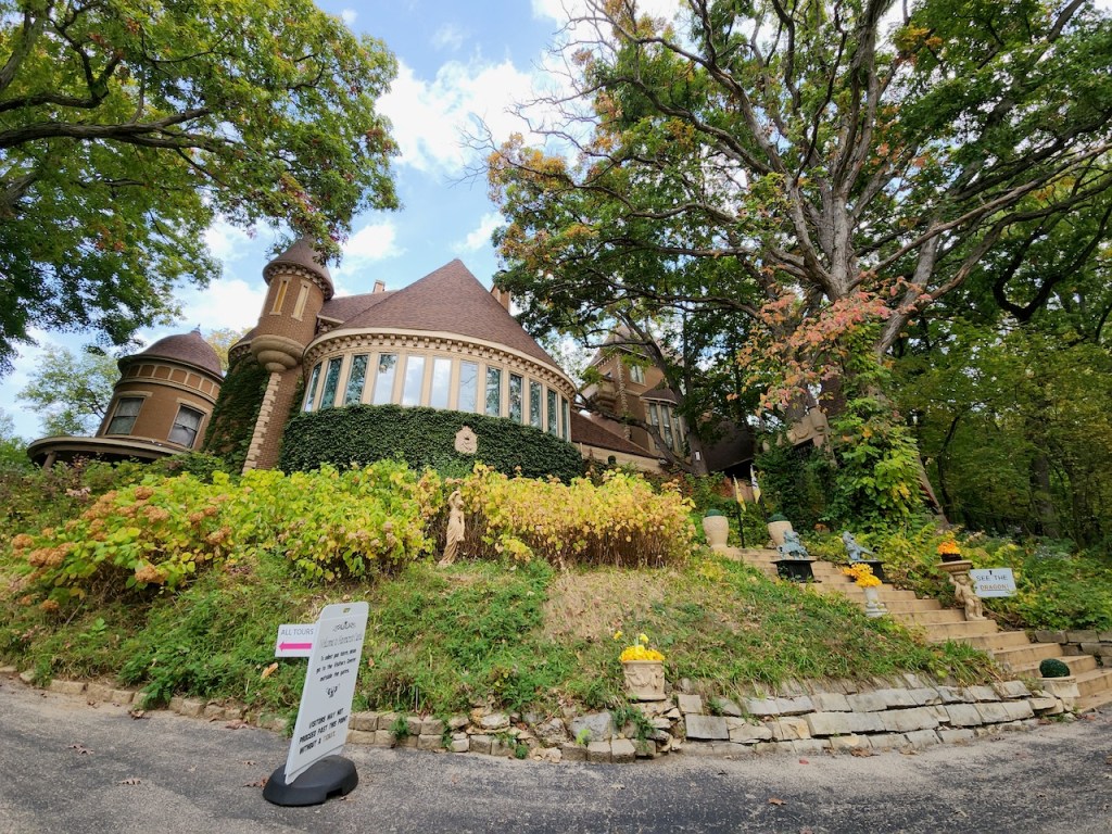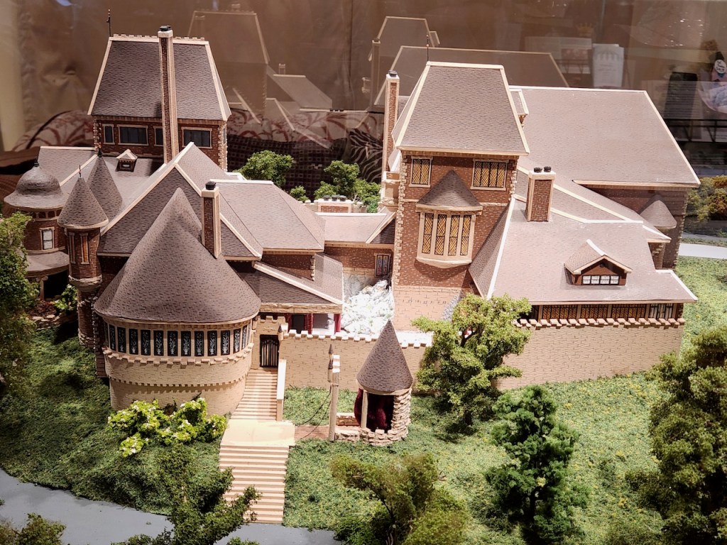 Trish had found the Havencrest Castle in Savanna – it is only open on weekends in May and October – and lucky for us the timing worked. The house was originally built in 1901 by Margaret and Francis S. Greenleaf in the Queen Anne style. It had two indoor bathrooms and a marble sink with hot and cold running water in the bedroom – quite luxurious for that time. The Greenleafs passed away in the mid 1940’s. The house went through several owners, and then in 1976 it was bought by Alan and Adrianne St. George. They eventually expanded it from the original 22 rooms to 63. That’s a model of the house as it is today, and some shots of the exterior.