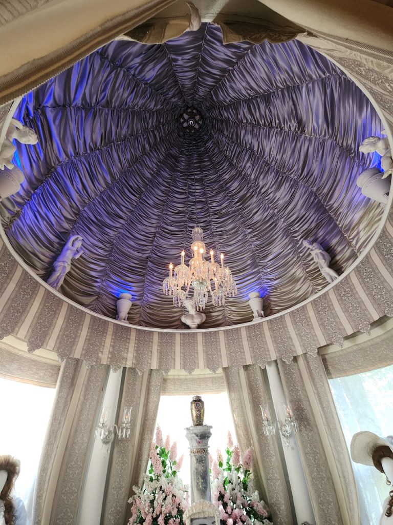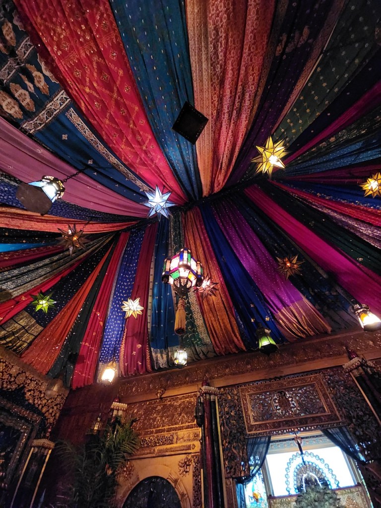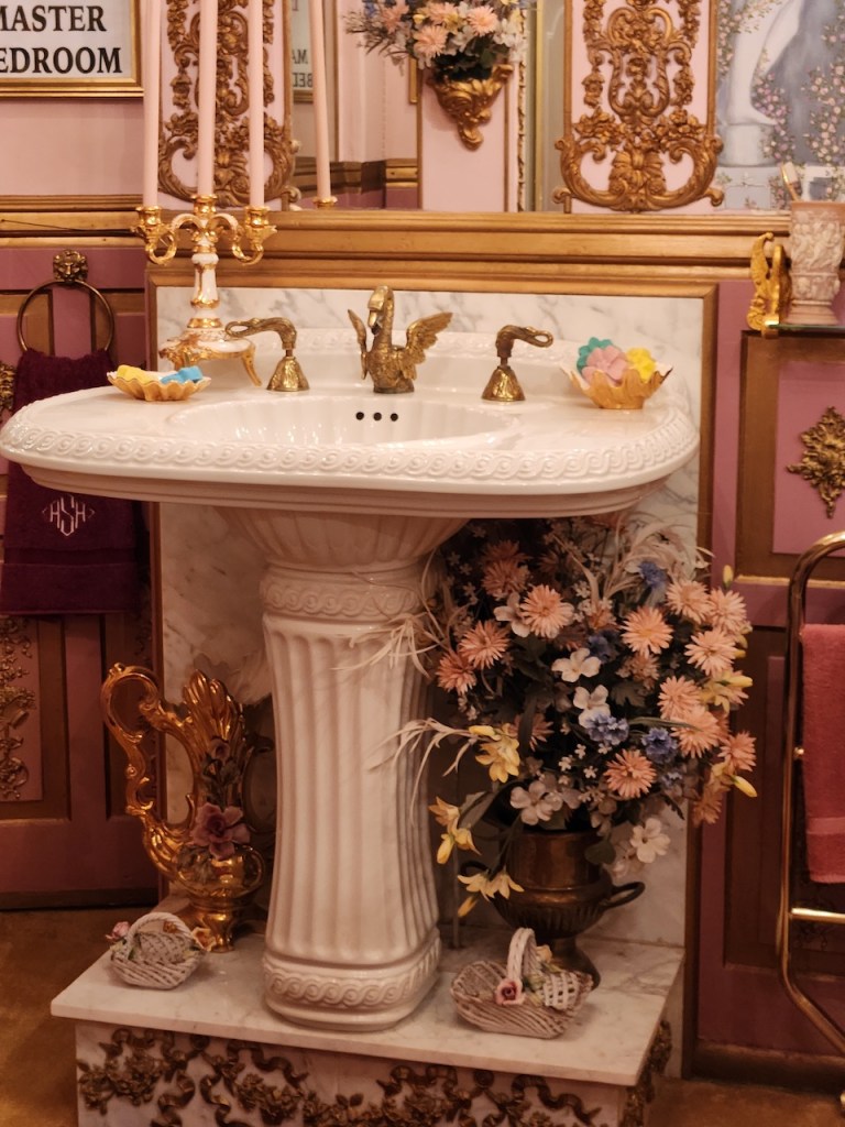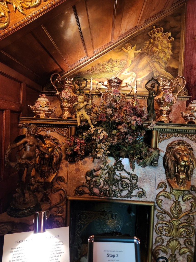The love between Alan and Adrienne began when Alan was 13 and saw Adrienne from a bus in Chicago. It turned out he was the magician’s assistant at the party she was at. Fate. They married in 1975 and when they bought Havencrest they planned every detail together. The “castle” is an over-the-top tribute to their love. Alan created many paintings and sculptures that were inspired by Adrianne, and that decorate the house. This first picture is the entry hall and that is Adrianne and George on the ceiling of the parlor. You can’t imagine the sensory overload we had for the hour we were touring the house.