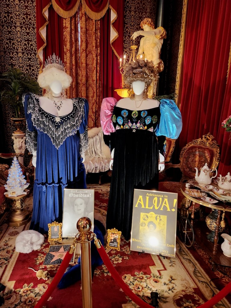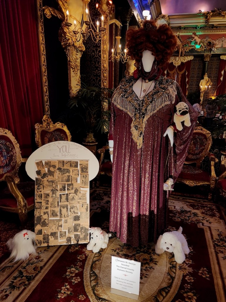 More of Adrienne’s gowns were on display in the ballroom. Adrienne was the founder of the county humane society, and many of the balls they held in the house supported that and other charities. After she passed away there was also a cat rescue named for her – Adrienne’s Angels.
