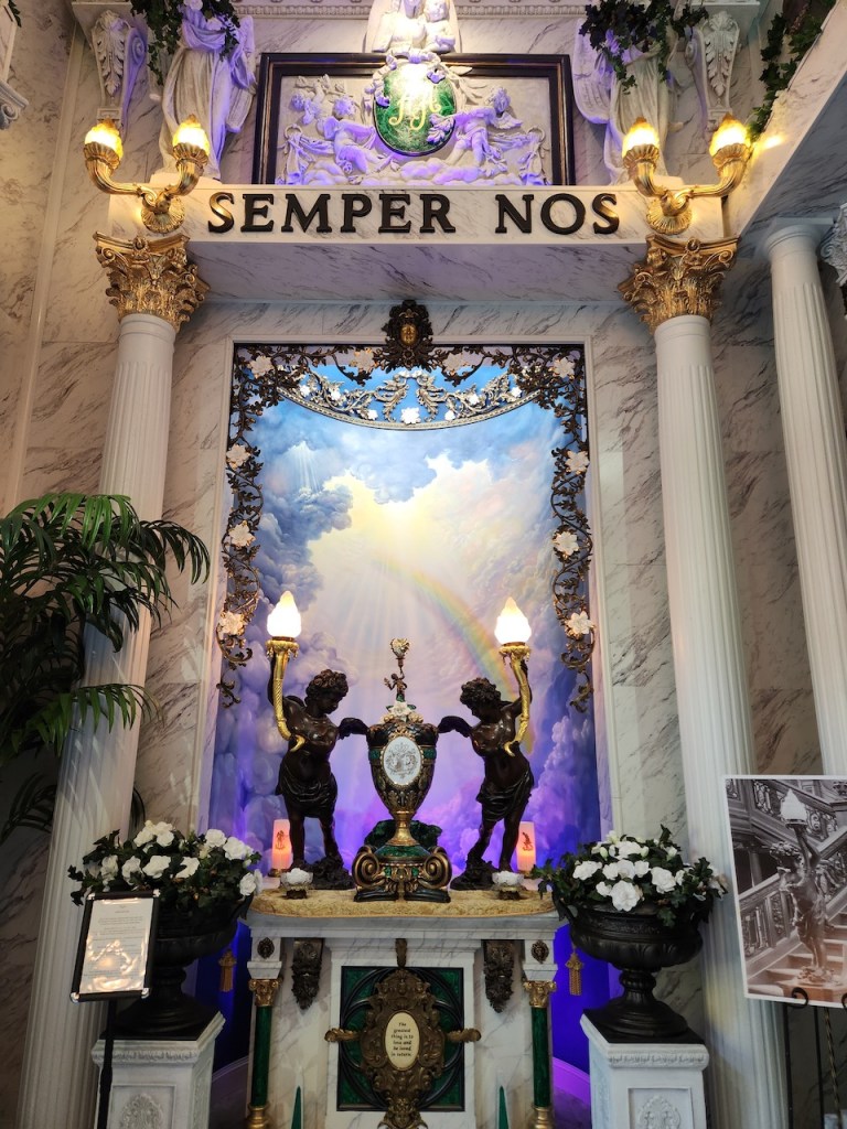 One of the other projects that Alan did was make a full size replica of the clock that was on the Titanic – this is in the last room on the tour. At the other end of the room is this display. Semper Nos is the couples motto – it means Always Us. (Hey Madara’s, does that remind you of anything?) This is the room (and urn) that will hold both of their ashes when that time comes. They never had any children and we didn’t hear what will become of the castle then.