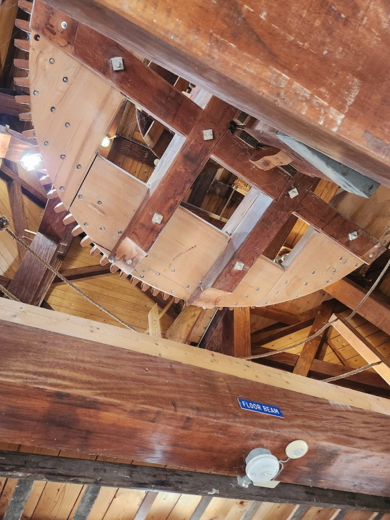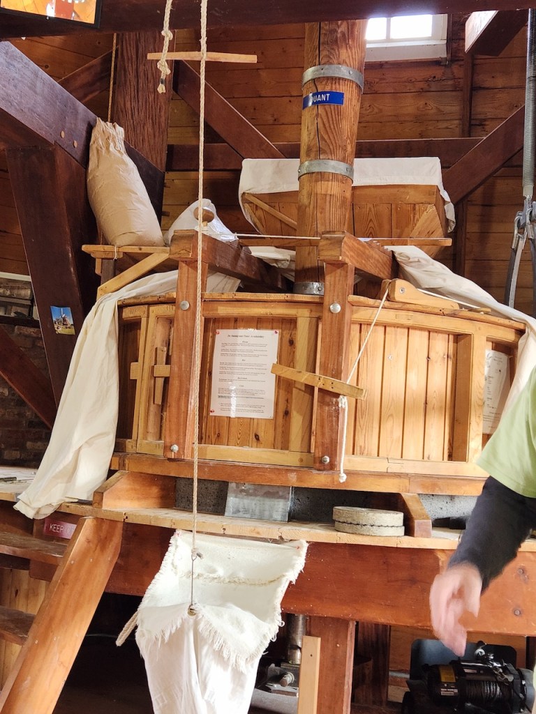 Yes, that’s me behind that cutout pretending to raise a sack of flour. It would have come off the mill stone that is in the wooden grinding box in the 2nd photo. The mill is tended by volunteer millers, but the wind was not brisk enough when we were there, so we only got an explanation of how things worked.
