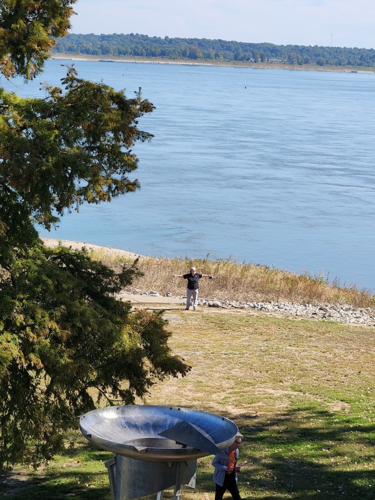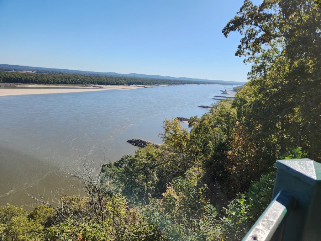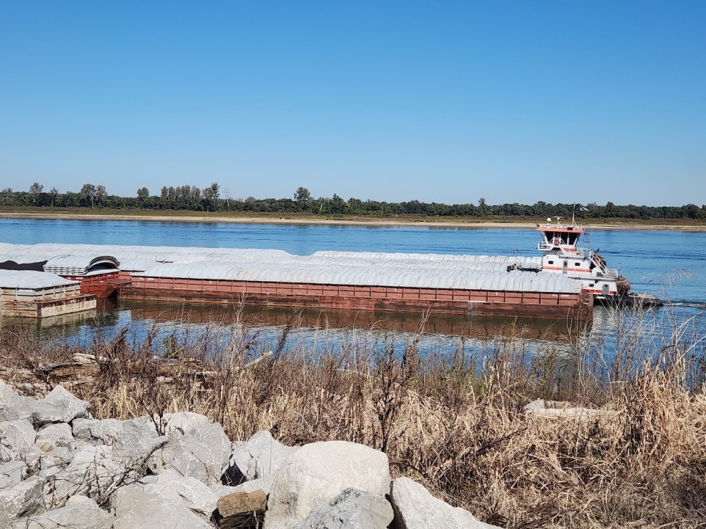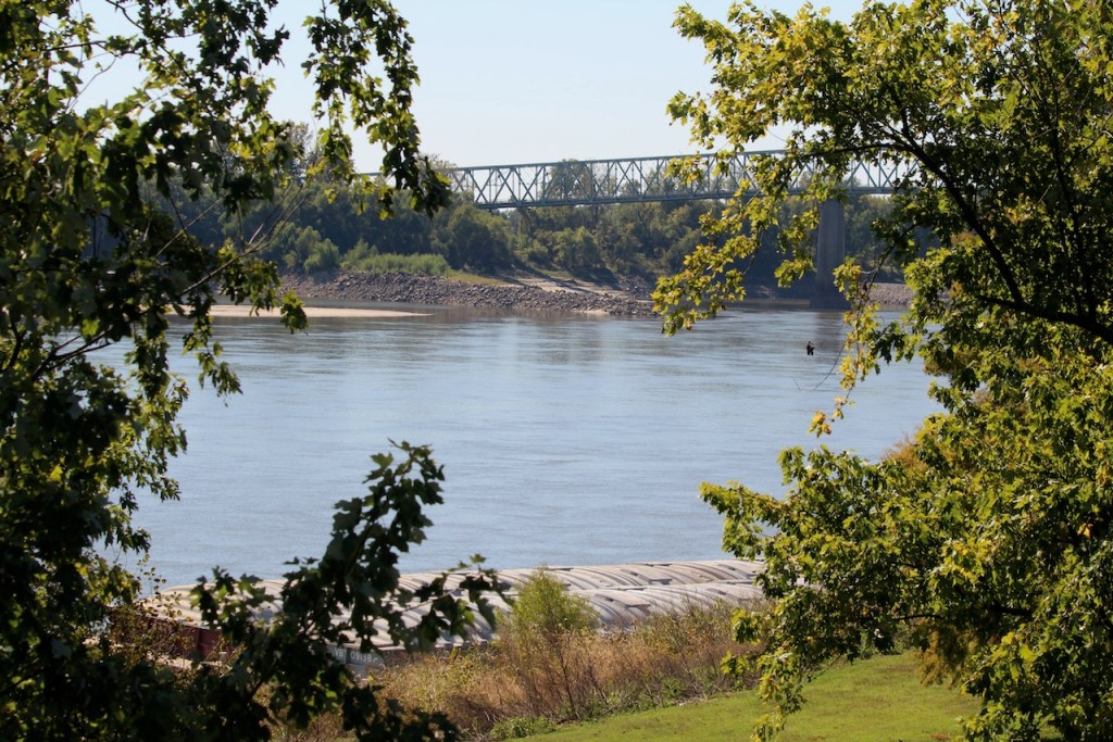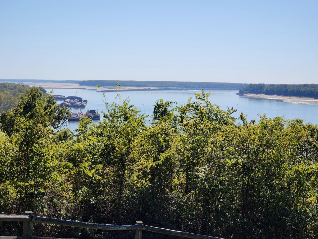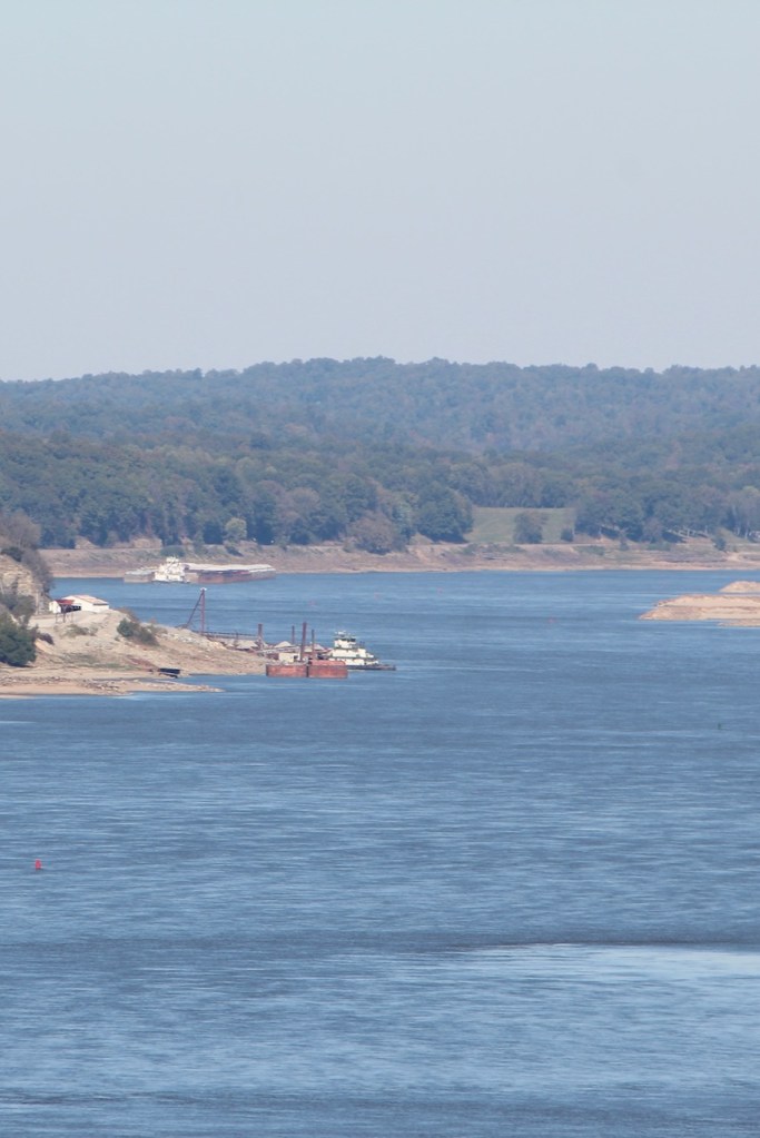 We then went to Fort Defiance State Park – which is at the southern tip of Illinois, where the Ohio joins the Mississippi. I heard that the current of the two rivers stay separate for about a mile after they meet. We spotted some loopers, maybe they were the same ones we had seen earlier, heading up the Ohio River. There was a tug putting together a raft of barges, and then you have another view of the Ohio. We met a very nice couple here, Bonnie and Craig, who were traveling in a camper van. They were from Ohio and were planning to be on the road for at least a year. We love our trips but have never thought about being gone that long.