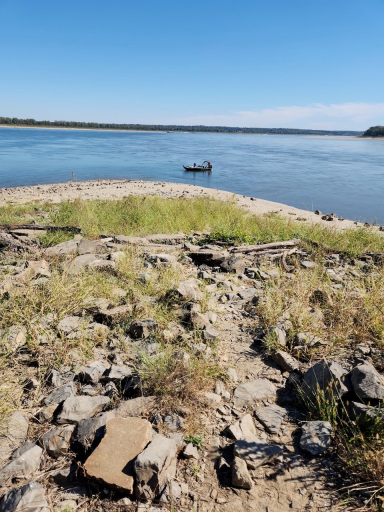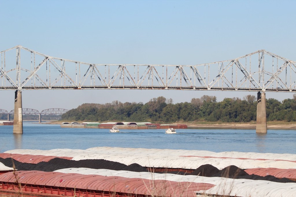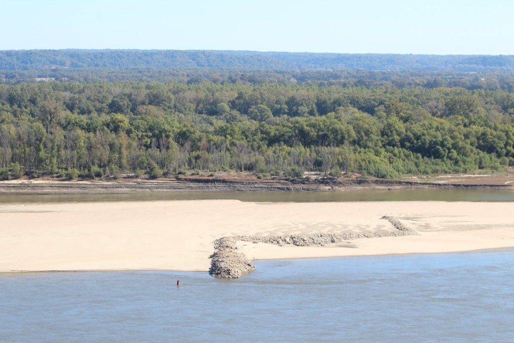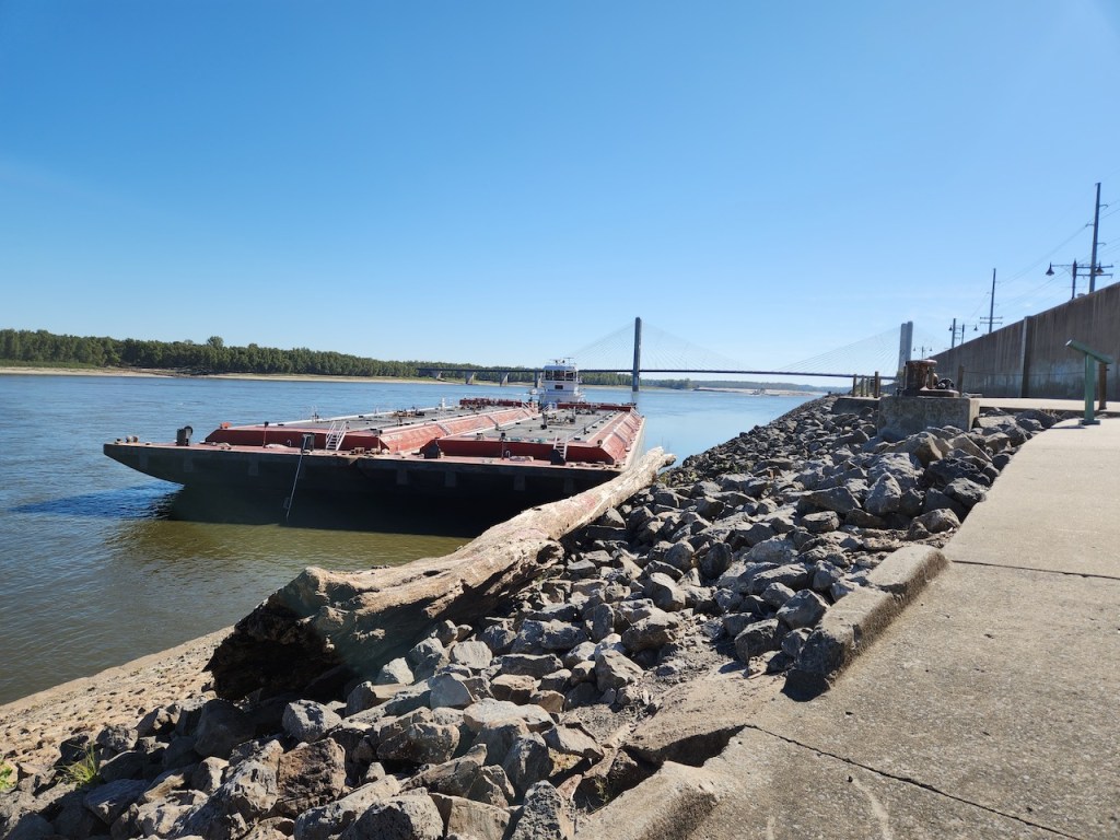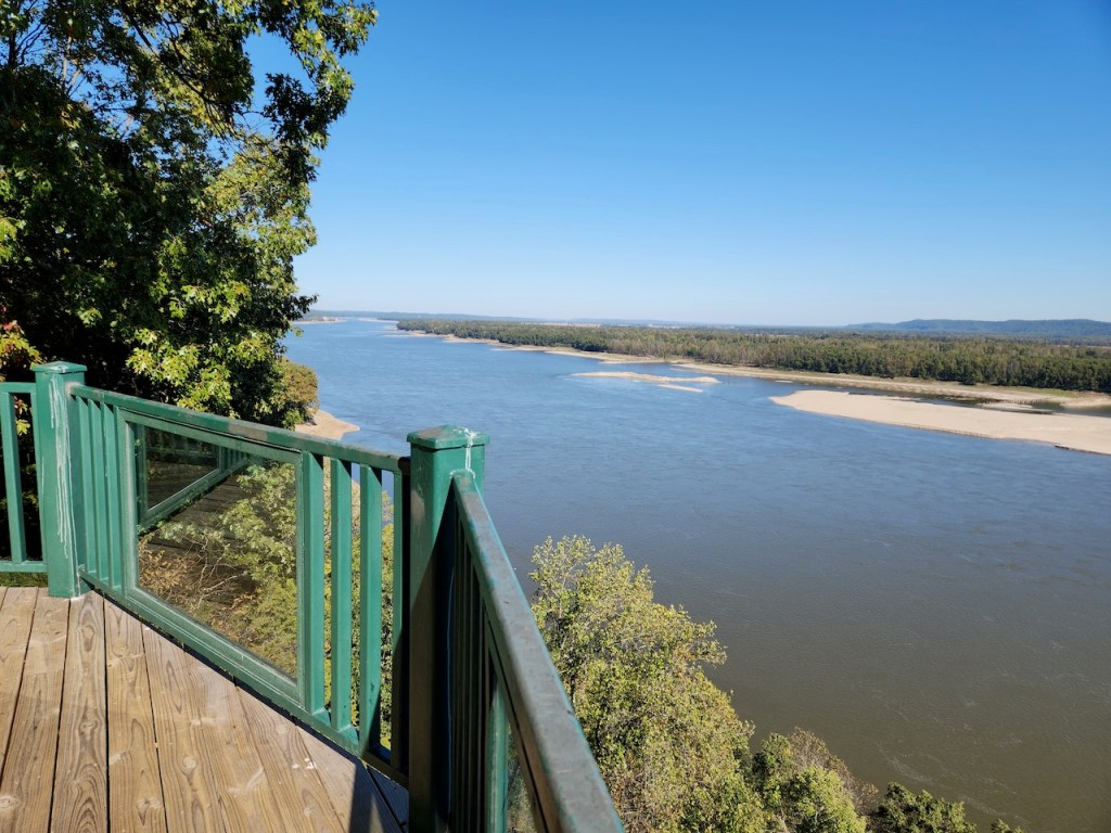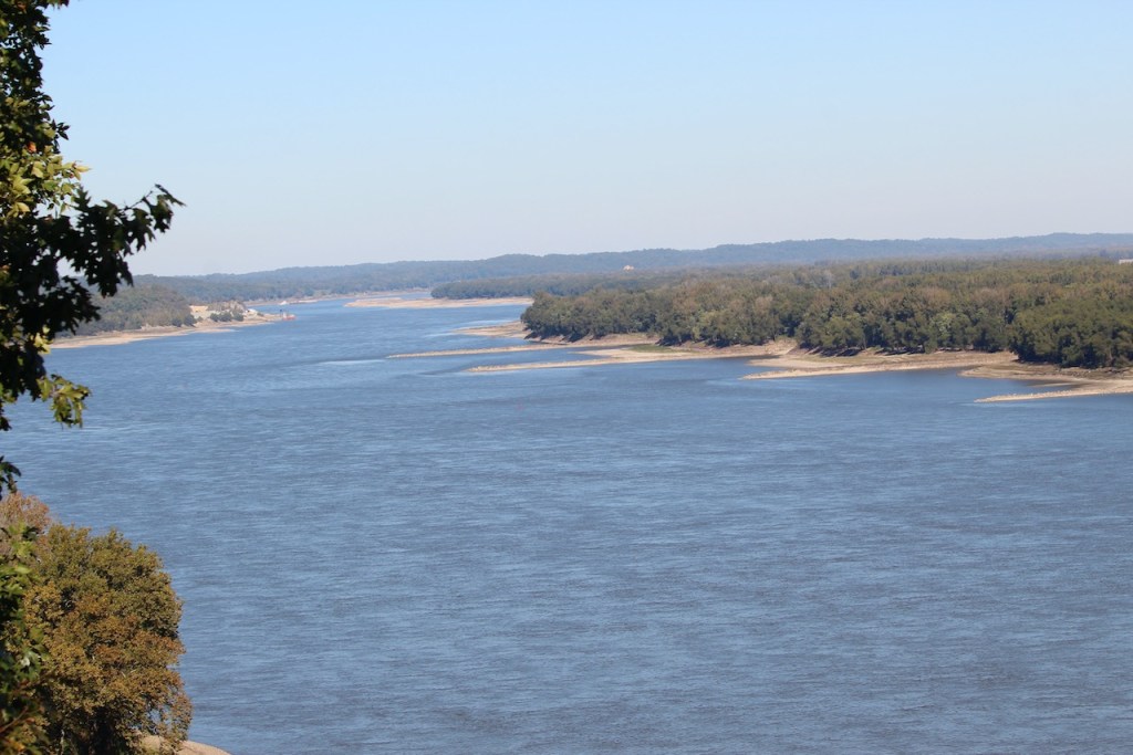 We then went to Fort Defiance State Park – which is at the southern tip of Illinois, where the Ohio joins the Mississippi. I heard that the current of the two rivers stay separate for about a mile after they meet. We spotted some loopers, maybe they were the same ones we had seen earlier, heading up the Ohio River. There was a tug putting together a raft of barges, and then you have another view of the Ohio. We met a very nice couple here, Bonnie and Craig, who were traveling in a camper van. They were from Ohio and were planning to be on the road for at least a year. We love our trips but have never thought about being gone that long.