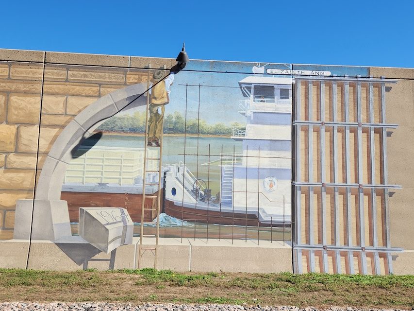 We also took a walk along the floodwall, which is decorated by murals that depict the history of the area. (We saw a similar set in Paducah, KY when we visited there.) We walked in reverse order – so that the way I have presented these. Dated 1964, the first one depicts the completion of flood wall, which is over a mile of concrete and earthen levees. The next one is depicting the Riverboat and Jazz ages in 1924/25. Then there is the statehood panel from 1921, and finally the Lewis & Clark expedition which came through Cape Girardeau in November 1803. There were about 20 others, but … figured that was enough history for you.