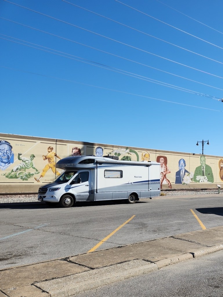 This welcome sign is on the river side of the wall, where we saw plenty more barges. Trish giving you perspective on the heights of some of the worst floods – that top one was from 2016 when the the river crested at almost 49 feet. The system is built to protect the area to a 54-foot flood stage. Our RV parked in front of the part of the wall that depicts those folks inducted in the Missouri Hall of Fame.