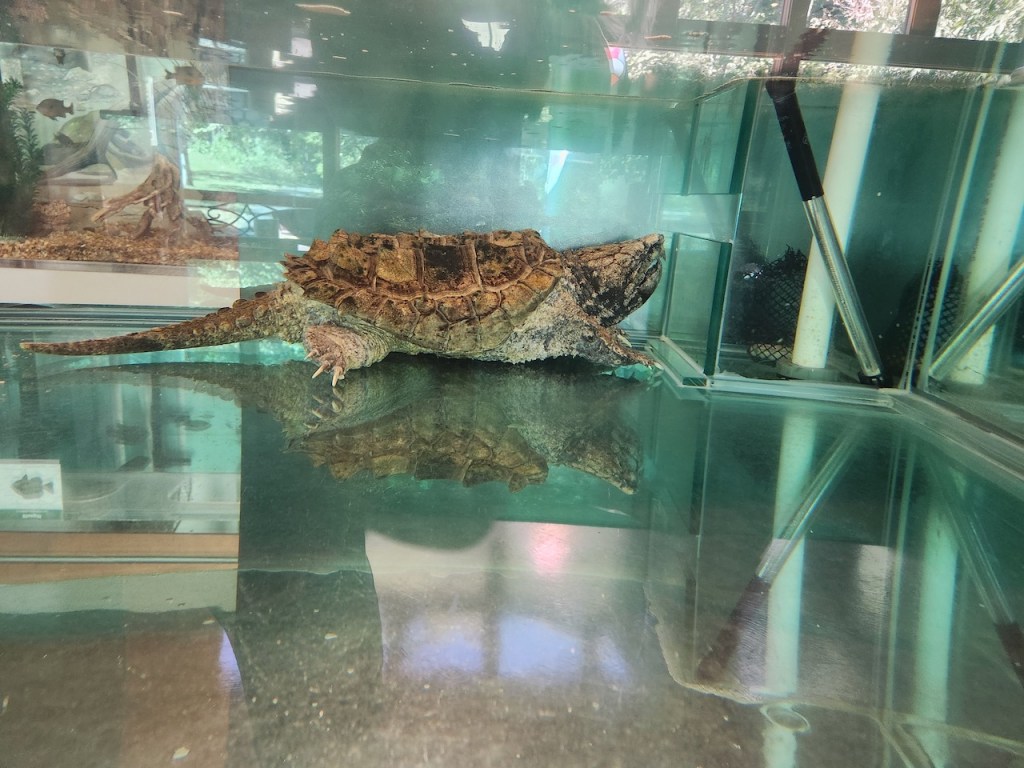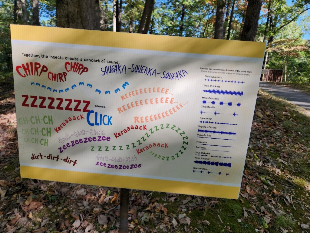 Again we looked for a spot to do some bird watching, and ended up at the Cape Girardeau Nature Center. They had some nice exhibits, including this alligator snapping turtle (wouldn’t want to meet one of those in a pond.) All of the purple flowers were covered with bees and butterflies. This was the trail that we hiked and there were these signs about the sounds the bugs make all along the way – we didn’t hear many of them, nor did we see many birds.