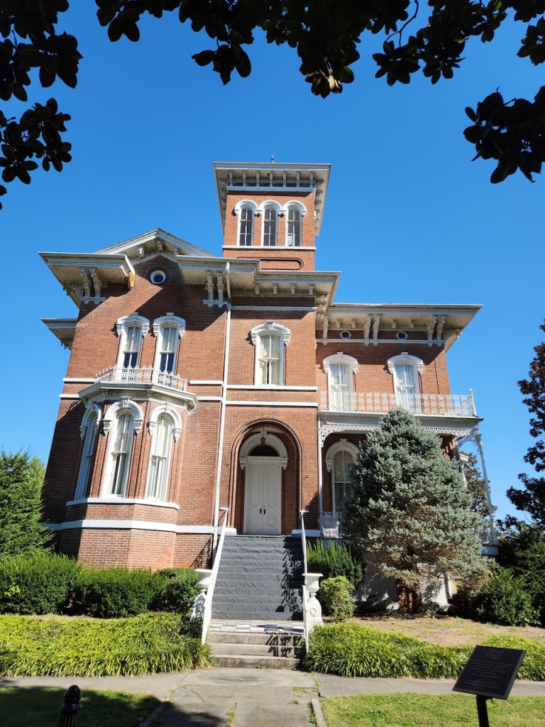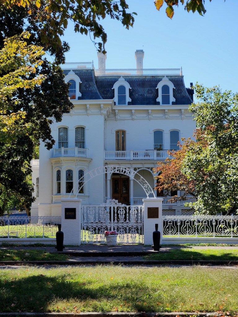 We then drove into the little town of Cairo, IL. We wanted to visit Magnolia Manor, which was supposed to be open for tours. It looked like there was a car there, but no one answered the door. It was built in 1869 for Charles Galigher, who had made his money supplying flour and hardtack to the Union army. It was supposedly decorated with period pieces – the little gazebo was on the property. And the white Victorian was across the street.