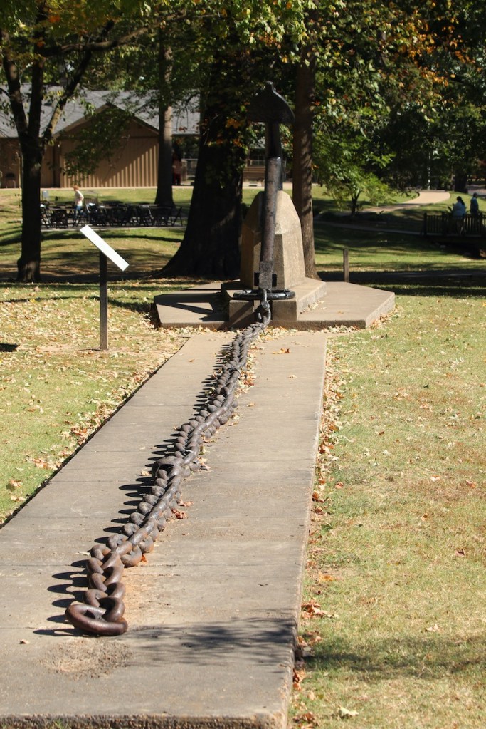 Kentucky was next up on the state list – it has the fewest number of miles (68) of the GRR. But we did find a place to stop – the Columbus – Belmont State Park. We ate our lunch and then wandered through the park. They had this chain – which was part of the mile long chain that was strung across the river during the civil war by the Confederacy to try to stop the Union boats going up and down the river. Each link weighs over 20 pounds, and it was supported by floats and pillars. It was removed when the Union occupied the site starting in March 1862. Once again, we were on the bluffs overlooking the Mississippi River.