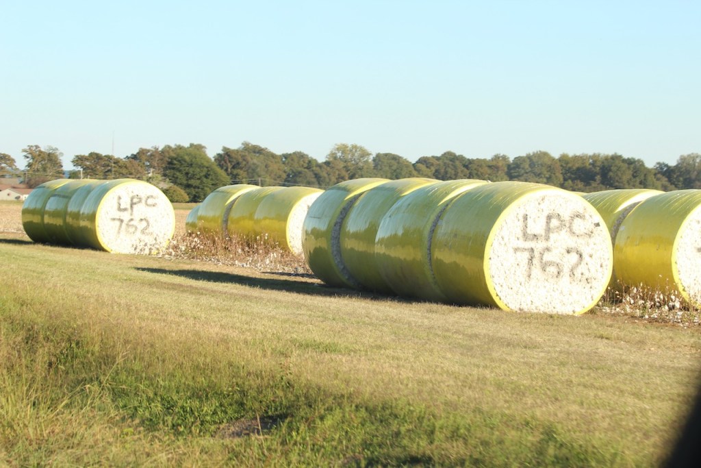 Then it was on to Tennessee – where it seemed that it was almost immediately that we started to see cotton fields, and these big bales of rolled up cotton. They were all numbered like this, I suppose to to identify them when they arrive at a processing plant.