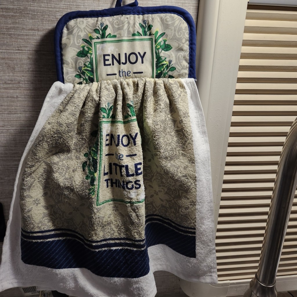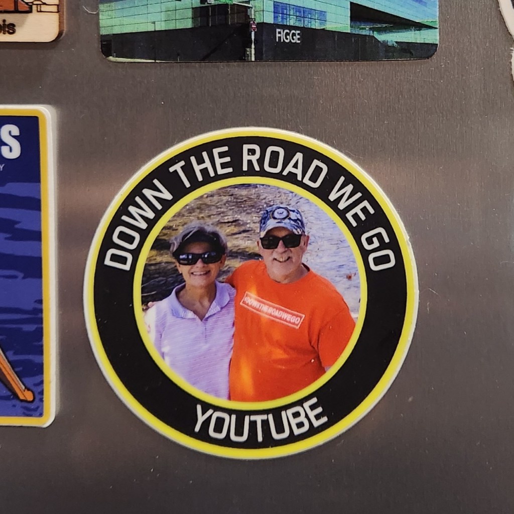 Here we are parked next to the garage at “Camp Sinclair.” It is a Boondockers Welcome site – which means you are staying at someone’s house. Dave and Shirley met us at the driveway, led us to the site and were very welcoming. They gave us a gift of a kitchen towel, and we made a magnet out of the card they had advertising their YouTube channel. We shared tours of our RV’s and swapped stories about our travels. It was a great visit, and they had better Wi-Fi than we get in many commercial campgrounds.