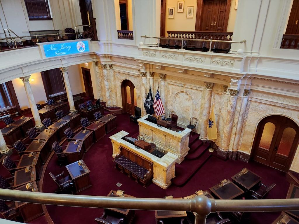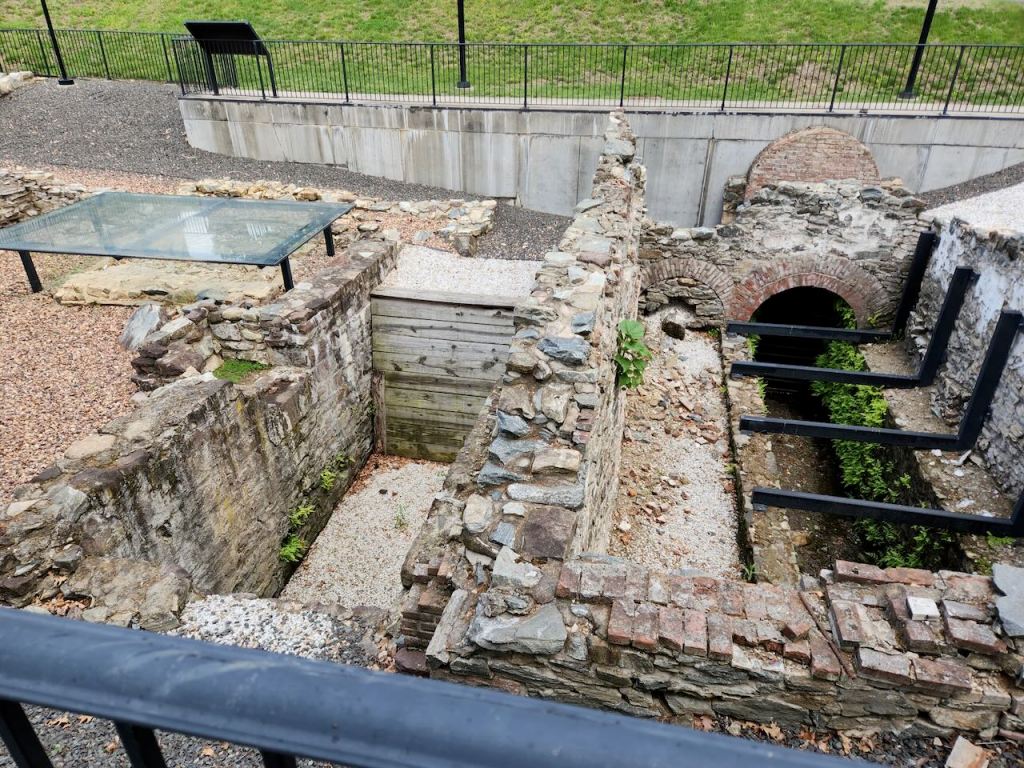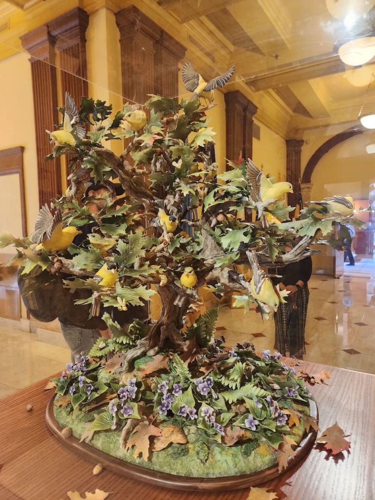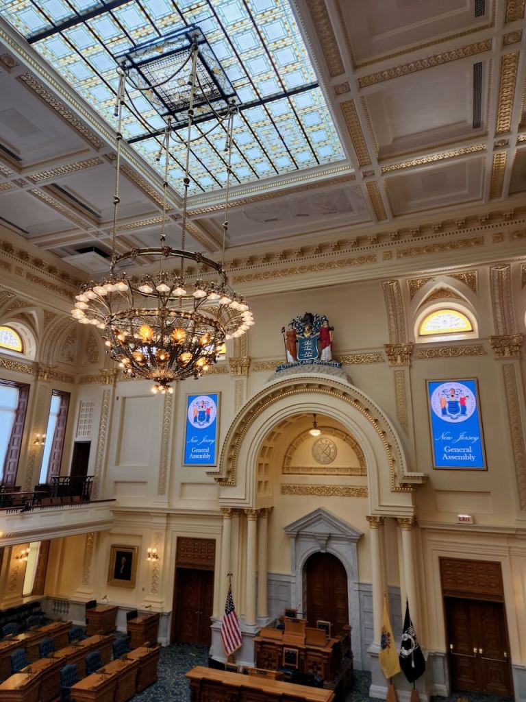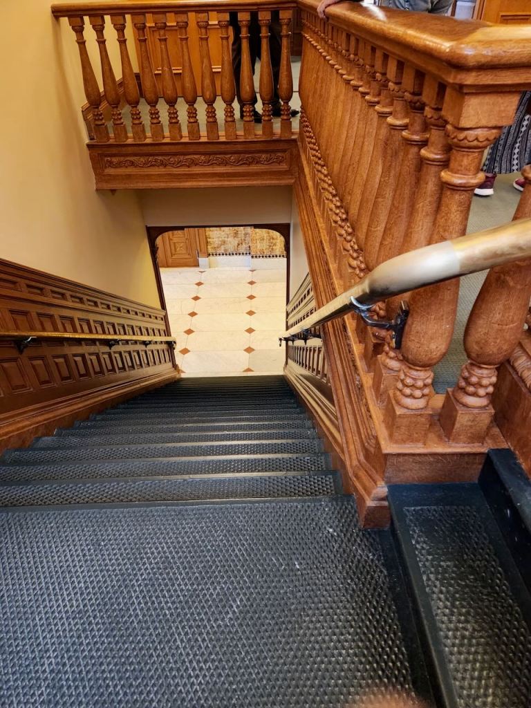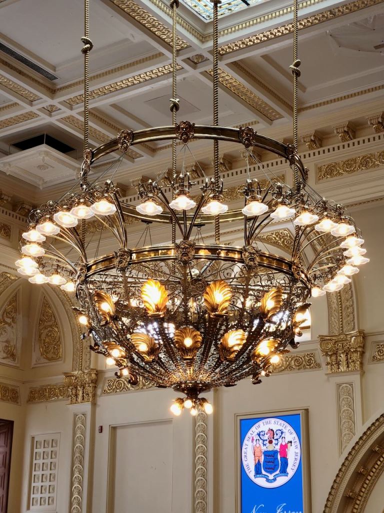 On Tuesday morning we left the brewery and went to Trenton. We had a reservation for a tour at 1 PM. I didn’t fully read the directions we received, so we ended up walking all the way around the building to find the way in – at least we got in some steps. The route took up by the remnants of a paper mill and gave us a decent view of the older portion of the statehouse, which was originally built in 1792. It is one of the oldest state houses in the US and is the only statehouse that has a view of a neighboring state – Pennsylvania is right across the Delaware River. The sculpture is called The Glory of New Jersey – it contains many of the state symbols – a northern oak tree with 21 goldfinches (for the 21 counties in NJ), violets at the base, there are 13 honeybees (for the each of the original colonies) and one lady bug – I read that is for the only female governor – Chistine Todd Whitman.. There are 3 original iron stairways in the building – this set is unique because the balusters are also made of iron – just covered to look like wood.