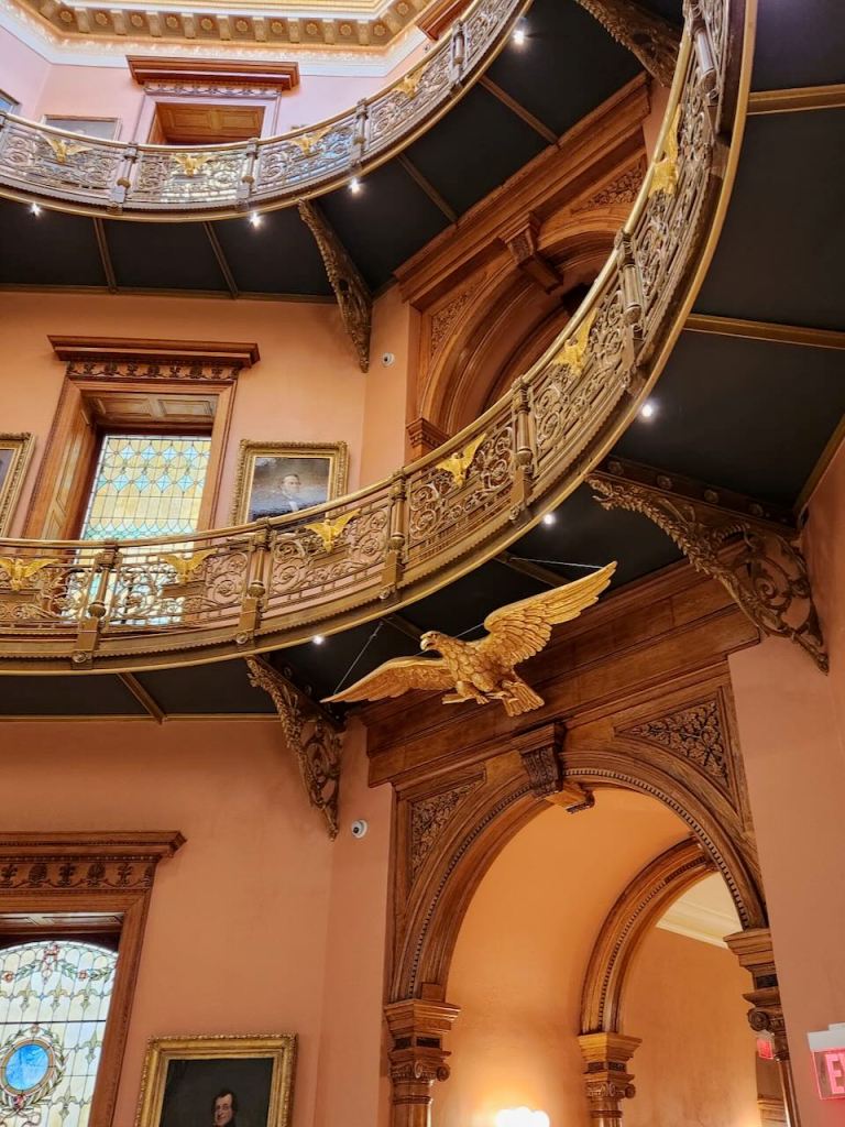 This is looking at the Senate chamber – which was less ornately decorated due to budget cuts made by the Assembly. So this chamber has this stained glass dome rather than a chandelier. And its wall and columns are made from scagliola – a type of faux marble made from plaster and pigments. It looks just like marble, but if you rap on it, it sounds hollow. And now it is more valuable than all the marble in the statehouse.