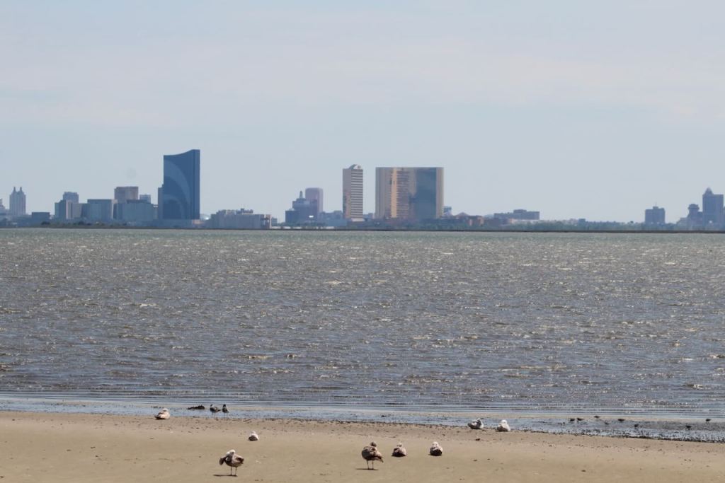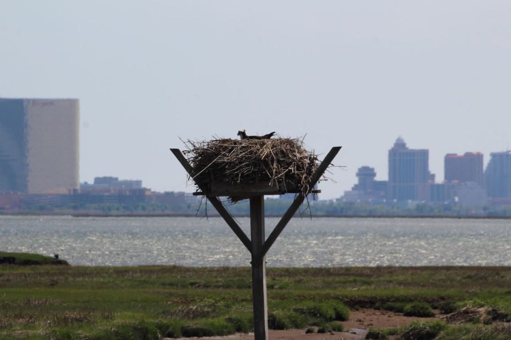 Shorebirds and osprey with Atlantic City in the background.