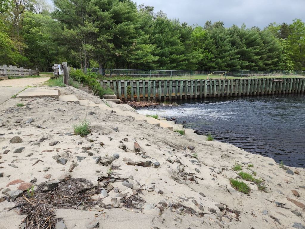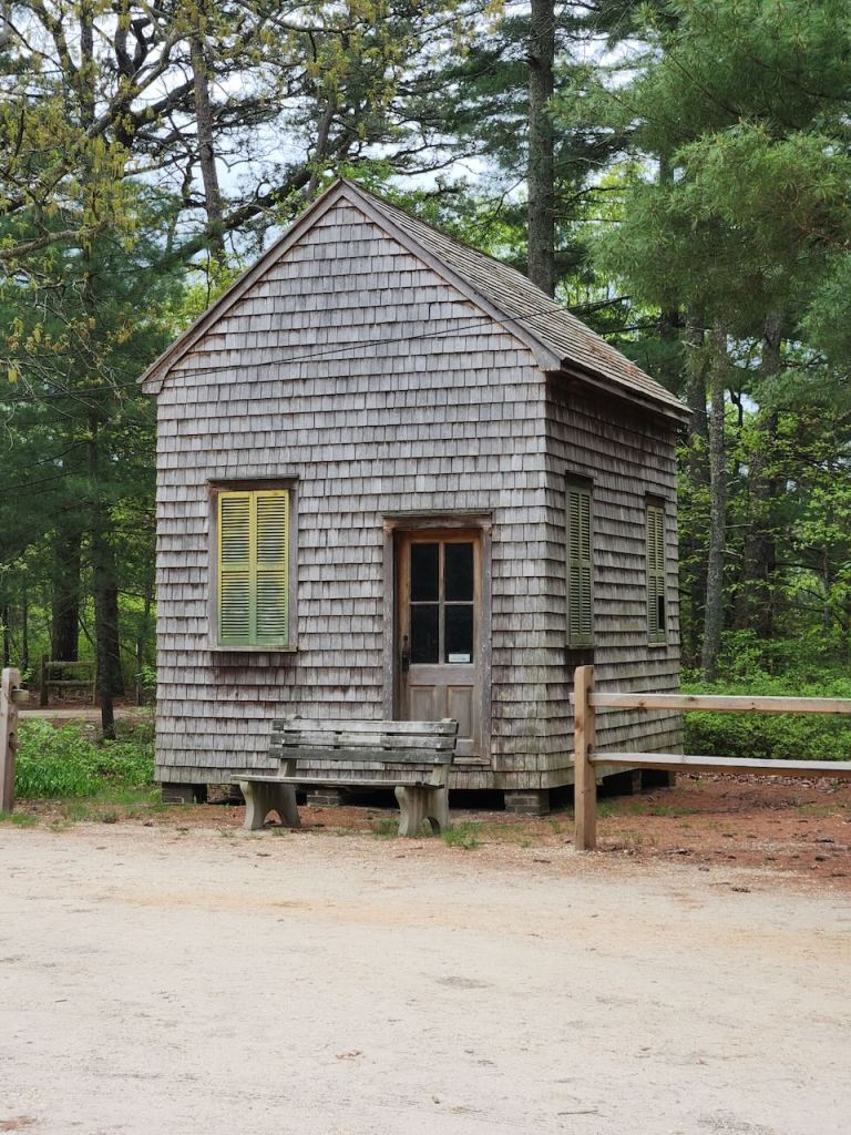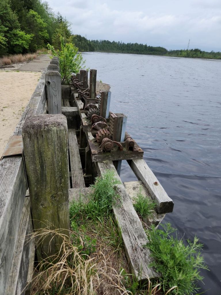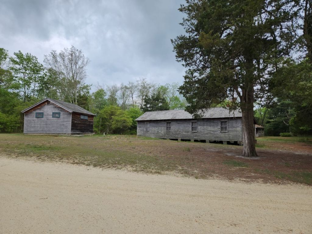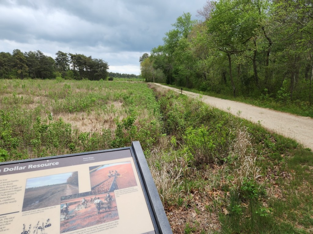 We got some pizza slices and then headed to Double Trouble State Park. It is in the pine barrens and supported an extensive lumber industry from the 1700s to the 1900s. As timber was cut, the cleared swampland created bog habitat ideal for growing cranberries, which began at Double Trouble Village in the 1860s. By the 20th century, the Double Trouble Company was one of the largest cranberry operations in the state. The cranberry industry ended at Double Trouble Village in the early 21st century. The park preserves many of the buildings. That’s the cranberry sorting and packing house (built in 1909 & 1916), the general store (built 1900), the bunk house (also 1900) and the school house (built in 1893 and used until 1914, then used to house seasonal workers.)